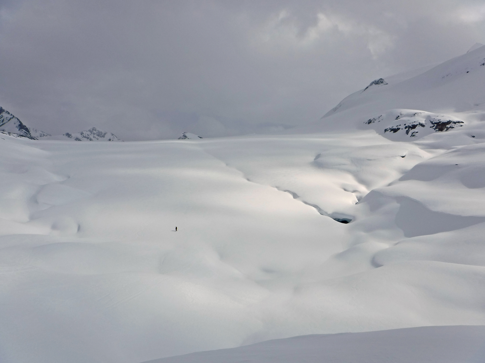 April 12. To the Continental Divide north of Division. Then a pitch along the crest using a rope for a hand-line. Then ski down to the rim of Icefall Canyon. Up to near Division 1. Icy again. At the end of the day I investigated the new ice tunnel. Just after the pitch-with-rope Katie spotted a wolverine crossing the divide to go east. Again, the icy conditions were hard on my knee.