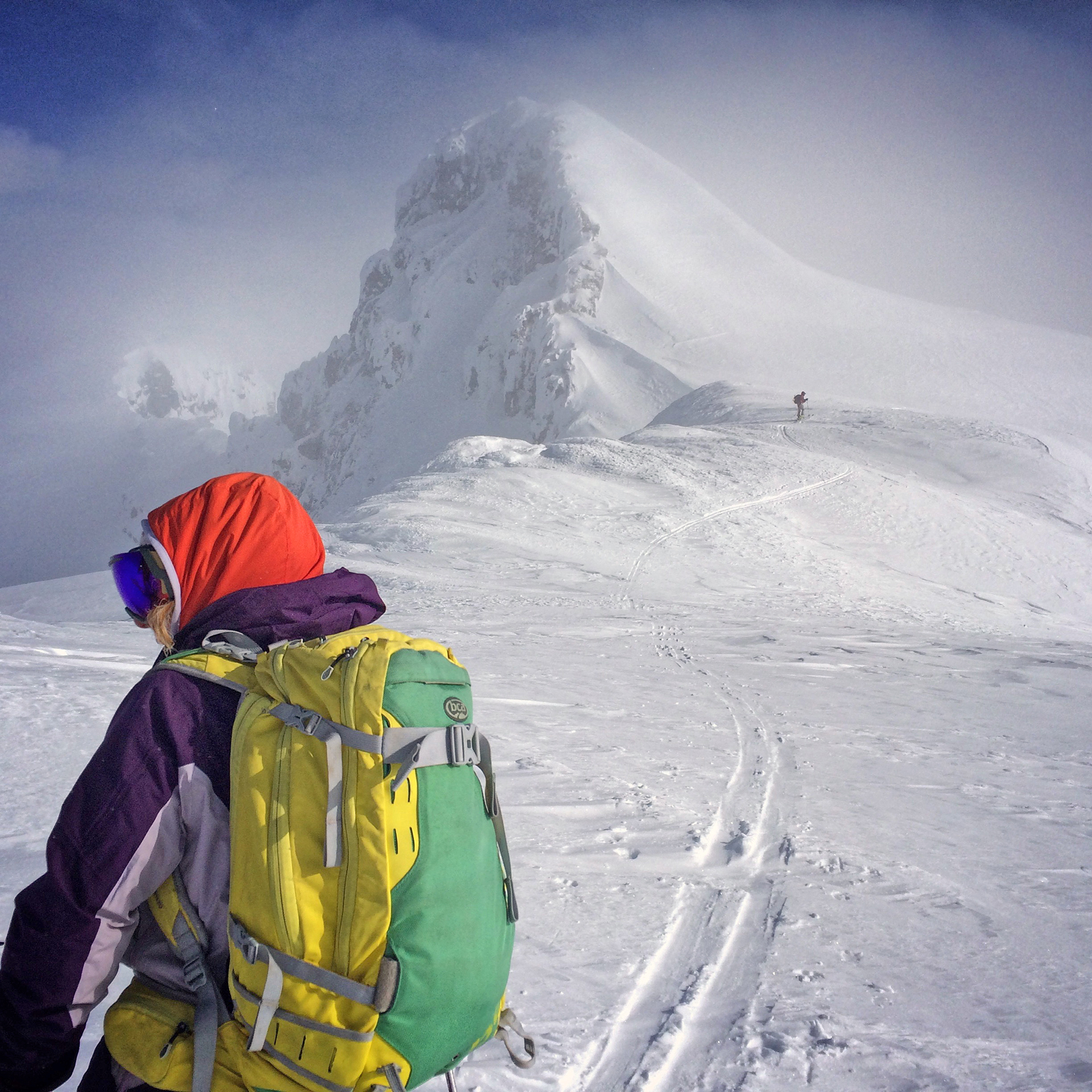 April 16. Saturday. To summit of Orbit Peak (8350 feet) with one bonus run on ascent. Some steep booting through a cliff band was needed to gain the upper bowl, and from there the route to the top was easy and spectacular. The summit views were stupendous, especially of Icefall Peak. We could look north and see the other group going up a steep couloir on Alien. Jonathan, Glenn, and I returned with Sofia and had a true steep powder run in the upper bowl. Others descended Terminal Velocity west back into the Icefall Peak basin and returned via Ice Pass. Great way to end the week.