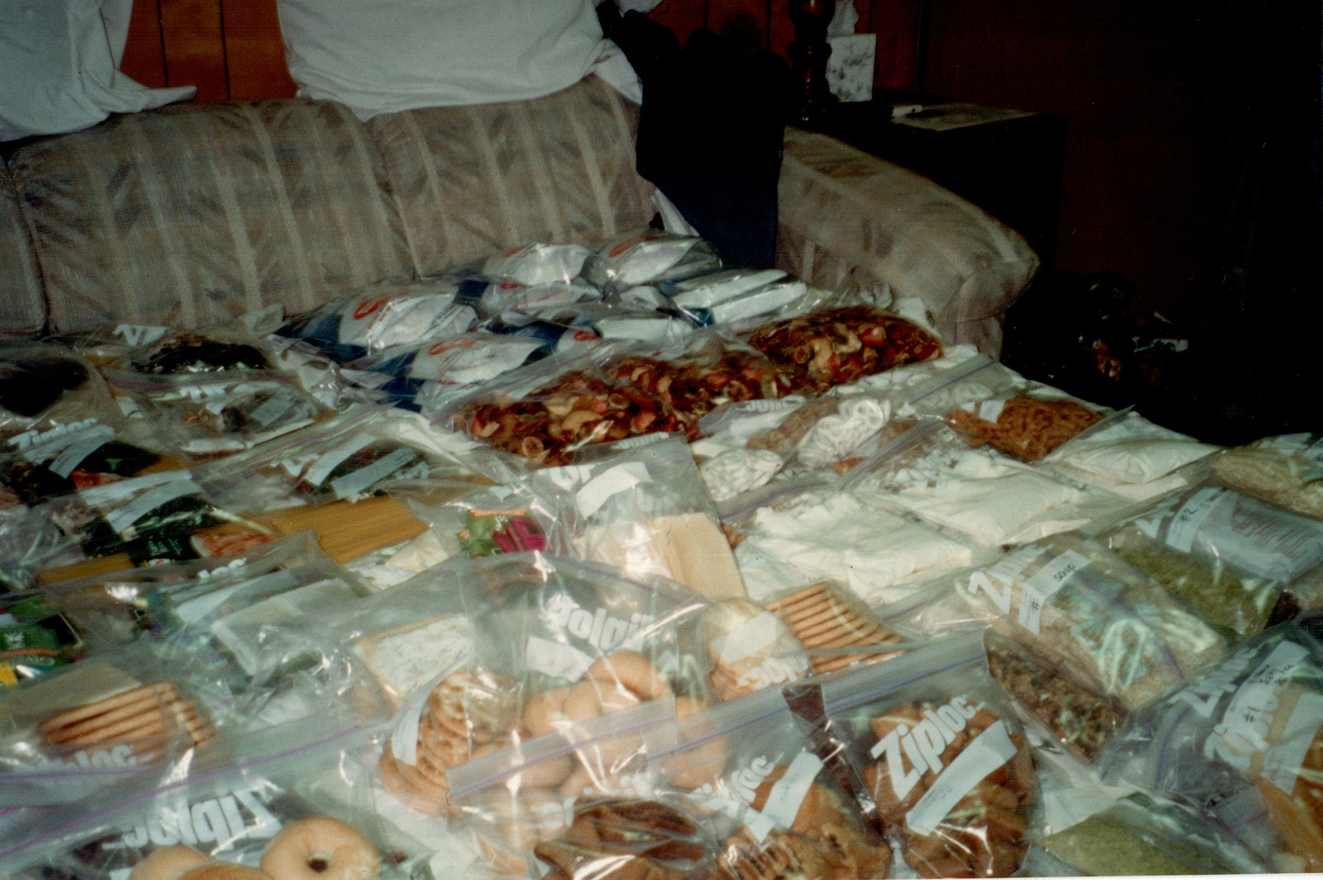 May 12, 2000, Friday: I lecture at the Univ. of Alaska on snow sculpture while Katie and Leslie buy and pack food. That is a very big job and it is a little intimidating to see it all laid out: ZipLoc bags everywhere. But finally it is all packed away in duffels. 18 days of food, with 7 more days of food for base camp. Susie arrives 4 pm. It is light very late here, until about 11:15 p.m., and K and S have never seen that before and are excited. One discussion we have is whether to move immediately from base camp and camp higher on the first night (Katie’s plan), or to spend a day acclimating (Susie is concerned, and has been altitude sick in Nepal (Ama Dablam base camp; going from 9000 to 15000 too quickly)). Probably it is sound to set up a base camp.