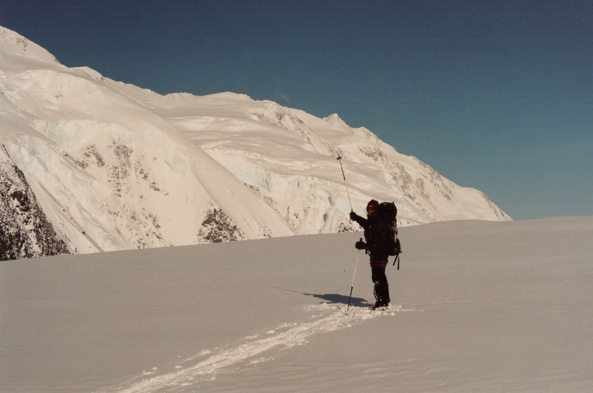 May 17, Day 3: Clear blue-sky morning. 19˚ in tent. A big carry to Camp 2 at King Col (13500 feet). This involved 4 miles and 2825 feet of climb and was quite tough because we had loaded the packs heavy. I am certain that the packs were over 60 pounds. This was hardest on Leslie, who weighs 115 pounds. We decided to leave our sleds at Camp 1, both because we felt that packs were better for ascending, and also because we had Robin Shaw’s diary with us, and he reported that some of the slopes to Camp 2 were too steep for sledding, and they carried sleds. This decision of ours would haunt us 12 days later.