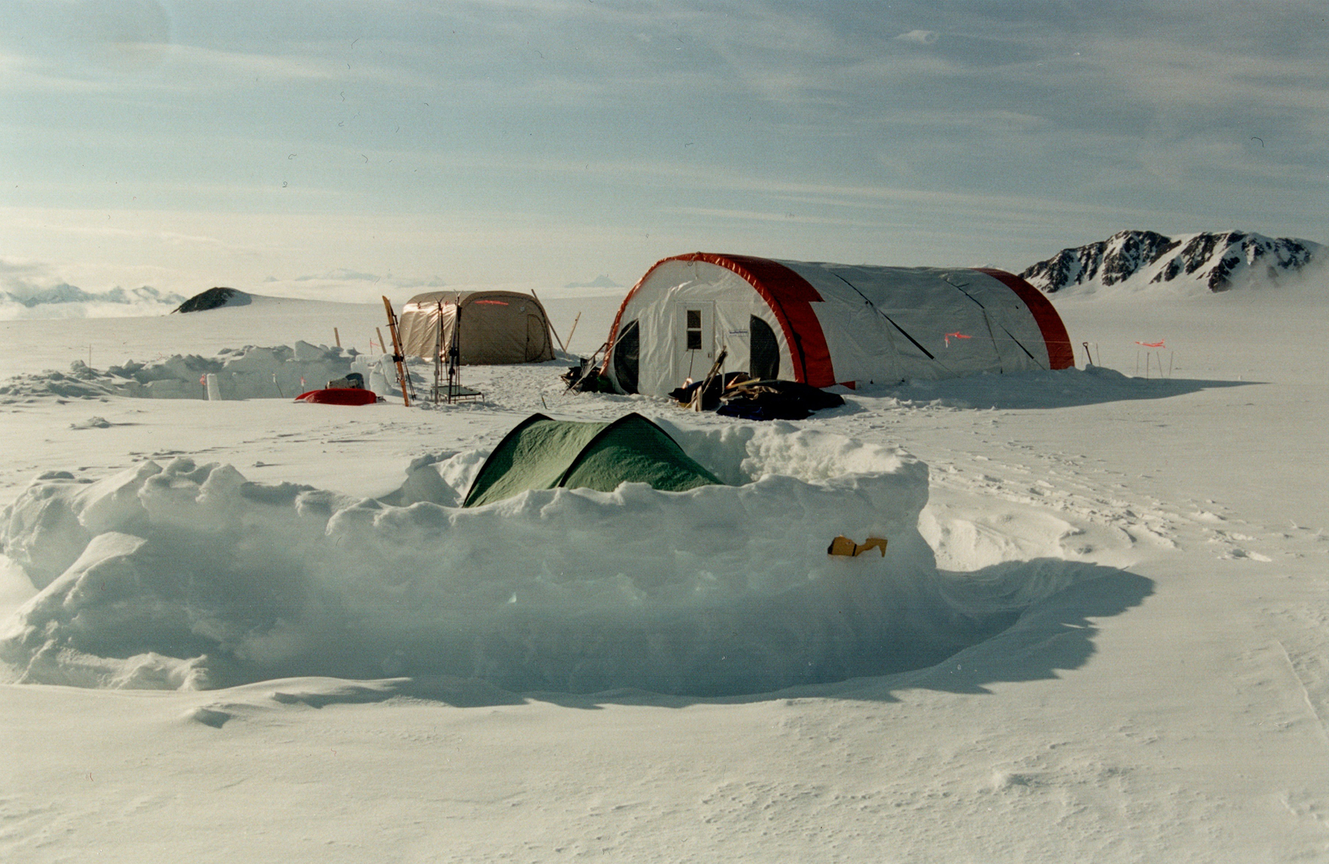 In June 2003, Joan Hutchinson, Phil Hage, and I spent a few days at the camp, run by Andy Williams and his daughter Sian Williams, high on the Kaskawulsh Glacier, flying in from Kluane Lake. This aerial shot by Austin Post from 1969 shows the terrain. The camp is right of center at the high point of the Kaskawulsh Glacier.