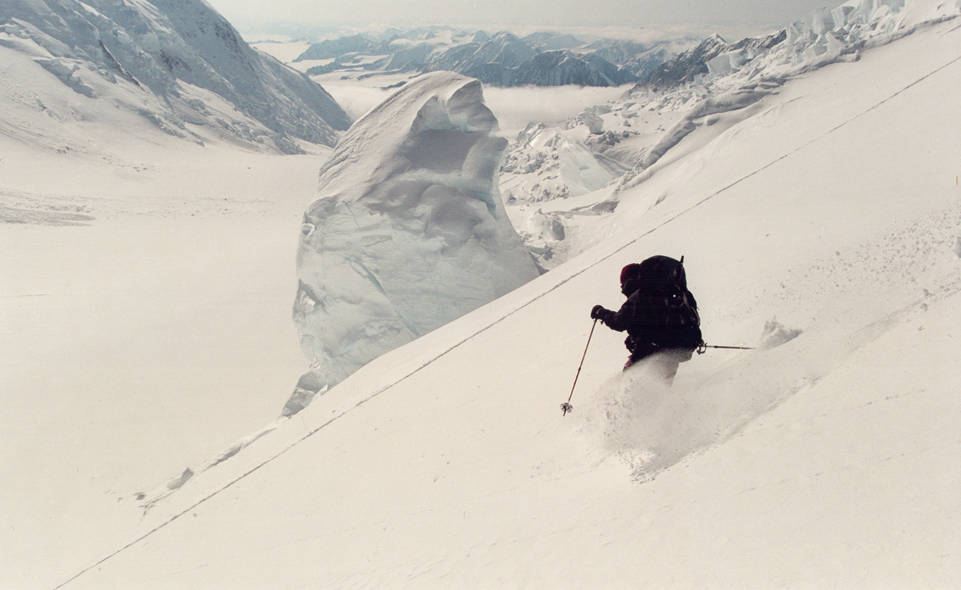 Another interesting contributing factor is the use of the word “plateau” to describe this whole area. “Plateau”, as in plate or flat. Well, it is not flat. There are crevasses and exposure in this area, and one needs a very exact plan in order to get the main summit. One can do as the first ascenders did and go over the top of the west summit, but that would add 1600 feet of climb to the day, which, for us, would have been too much. One could also go very low and take a direct route — that might have worked. The traverse we tried still seems like the best route, but one needs very good information as to where one should traverse. As Ruedi Beglinger later told me: “For this choice, if you are a little too low or too high, you are in trouble.” Our feeling now is that we should have ascended the slope to the west peak on skis (as opposed to the roundabout cramponing route we took—we were too low), and then traversed on the shoulder quite close to the W Summit.
