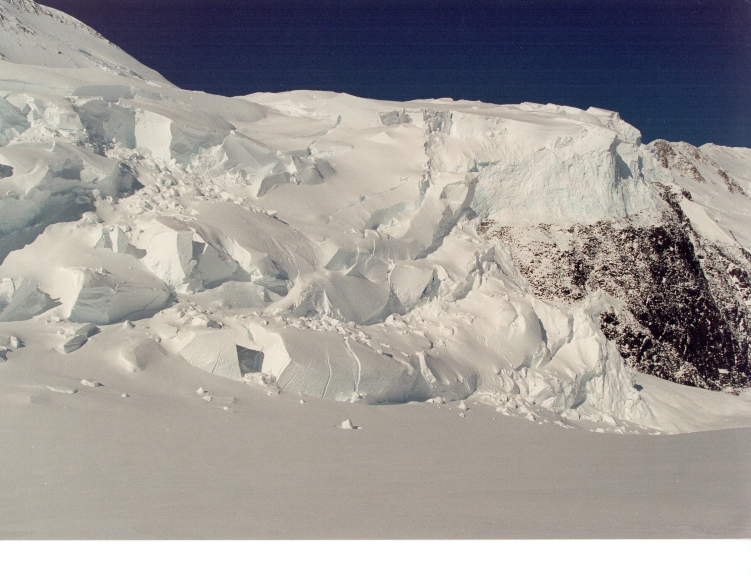 The terrain was beautiful with giant seracs on the left and the rocky, icy slopes of King Peak on the right. The camp was hidden until the last minute, and I had thought (because of an error in locating the altitude of Camp 1) that we had only 2500 feet to do. Thus the crew was quite exhausted when we reached camp at 5:40, 6.6 hours after starting. There were lots of walls there and two people: Jennifer Olson from the 3-person glaciology team and Karsten Heuer from the 6-person team leading blind Ross Watson. We cached our gear in an igloo they had built and headed down quickly. The girls are all expert telemark skiers so the trip down (unroped) was most enjoyable: 30 minutes. This day afforded us our first view of The Icefall, which is the steep terrain above King Col. This is generally the route-finding crux of the route, with huge seracs that must be negotiated. Indeed, the seracs of this section are by far the largest I have ever seen. But there are tracks (boots) up a steep slope and looking at the angle we are confident we can ski up the near 45˚ slope.