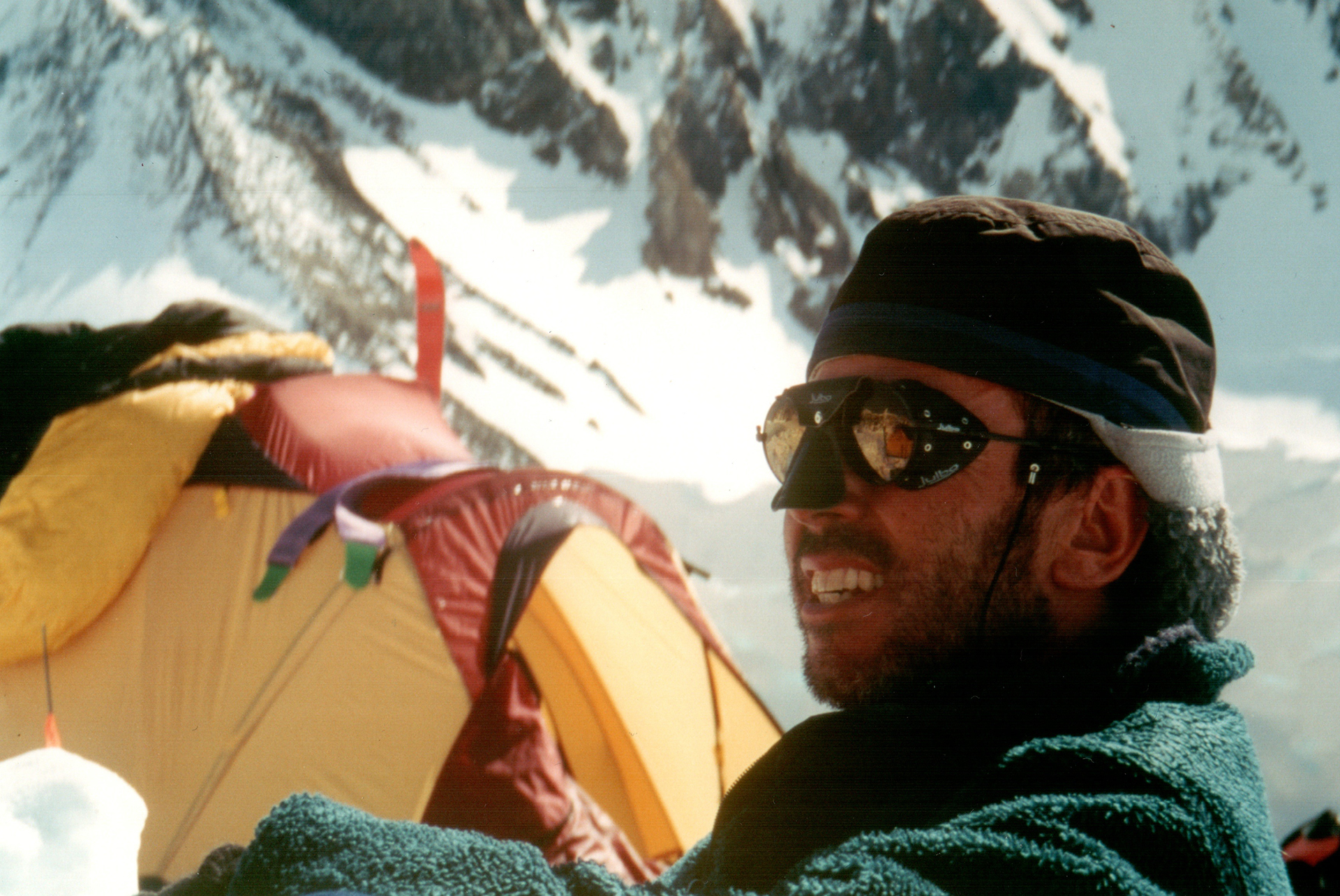 THE RUDI SUDRICH STORY: At 8 p.m. I was outside urinating when I saw a fellow coming uphill to the camp with no pack, no sled, and no skis. Bizarre. Well, he had just skied down from the summit and was a little lower than our camp, so he walked up to collect some stuff from his cache. He had been here with Judy Hartling, but she got a urinary tract infection and had to go back to base camp with Rudy to fly out. Rudy suggested she had not eaten nor drunk enough. Then he came up quickly from base camp to the summit. They were the first to find a route through the seracs above King Col, a job that took them two days. He is a former coach of the Canadian nordic ski team, and coached them at the Lilliehammer Olympics. He is Czech, but has lived in Whitehorse for 20 or more years. He also said that the other side of Prospector Col was too icy to ski and he had to use crampons. Yet it was possible to ski to the summit. This was very surprising news.