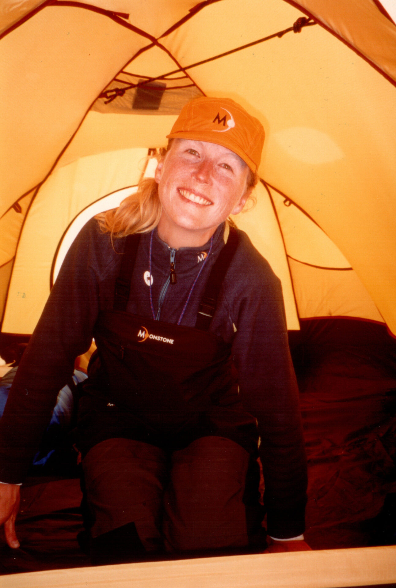 We were fortunate (thanks to Susie’s initiative and enthusiasm) to win the Moonstone People’s Epic Contest for 2000, which yielded us a nice sponsorship package (cash and gear) from Moonstone Mountain Equipment. And we were fortunate to have good weather at Camp 4, 17000′. Note the Nepalese prayer flags. Rear: Susie Sutphin, Katie Larson. Front: Leslie Ross, Stan Wagon.