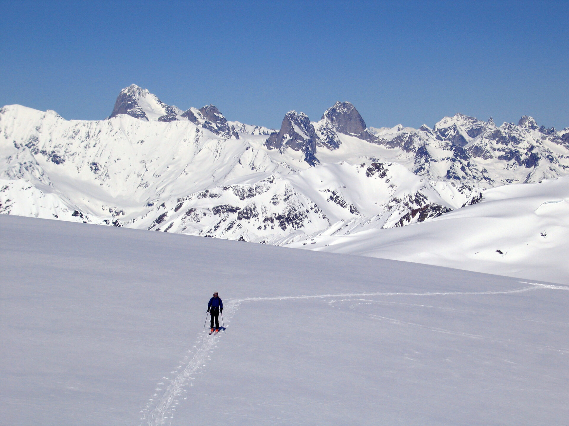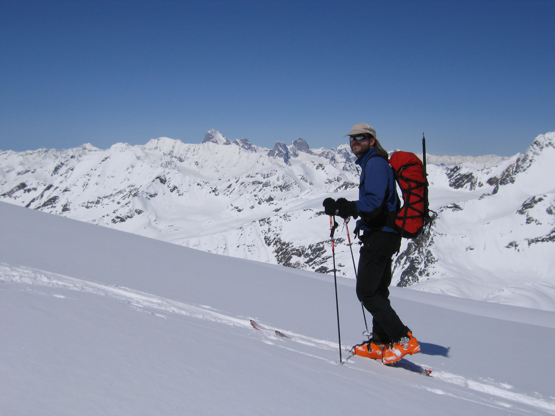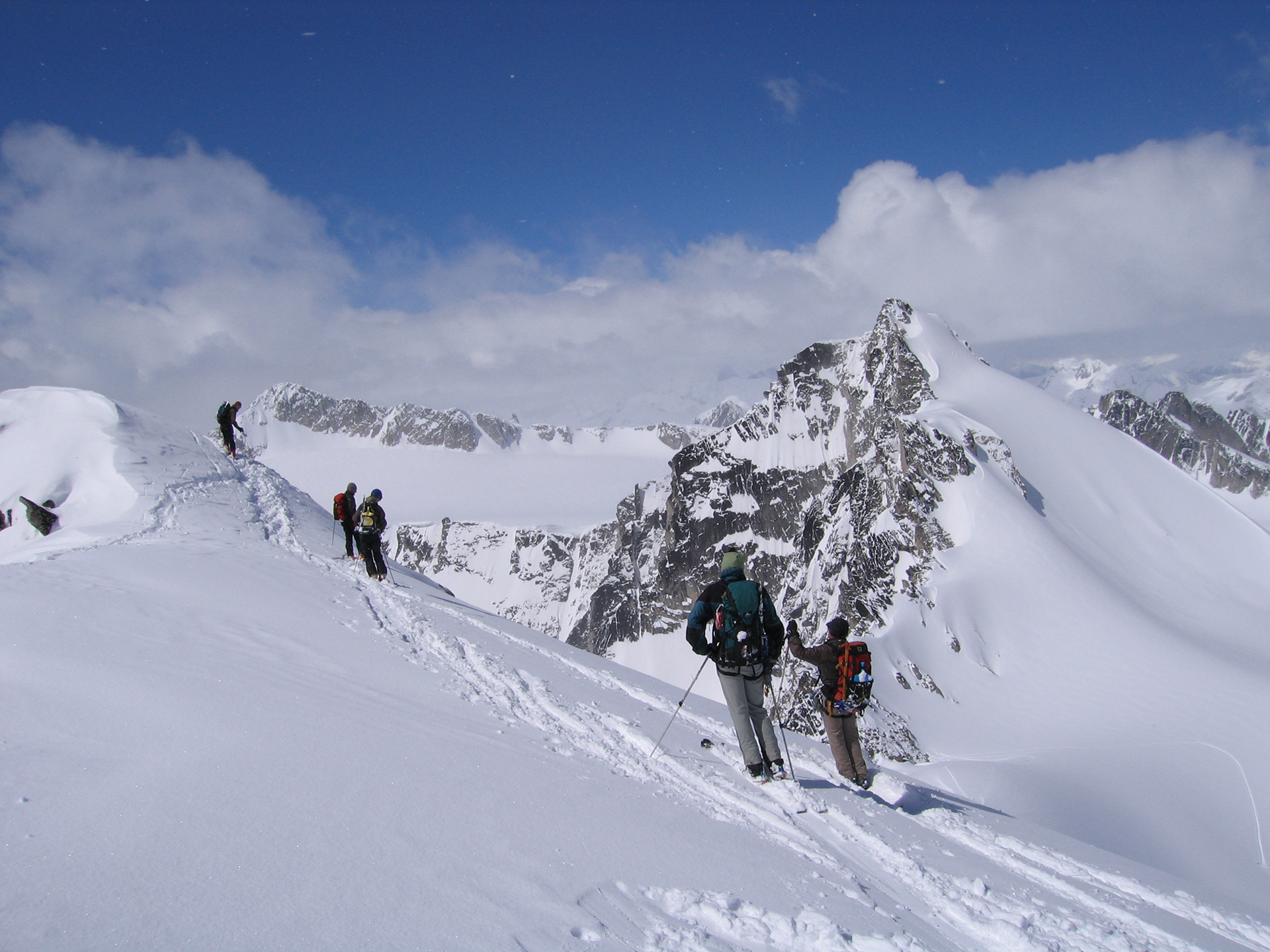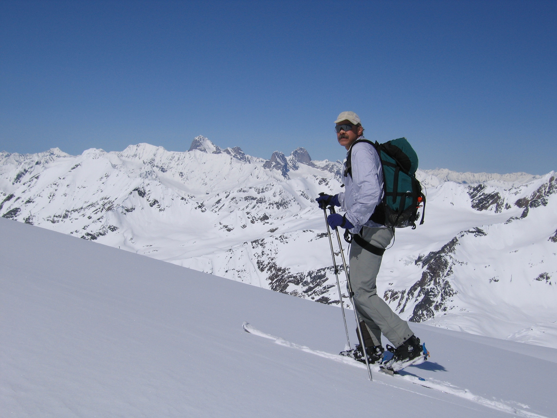 Our group consisted of Rob Nachtwey, Bob Portmann, Jonathan Kriegel, Chet Roe, Rylan Cordova, and me. Here is a brief report. Airspan Helicopters with pilot John Christensen got us in from Invermere on Sunday when the weather broke briefly around noon. We skied Gwendolyn that day, with three of us making the summit. On Monday we went to the North Star Glacier and summited Alpha Centauri, which had fabulous, and stable, conditions on its steep northeast face. From there we went to North Star peak with four summiting and two stopping just below. The east face of that was attractive—too attractive. Rob jumped in and started a class 2 avalanche that shook us up a bit. He was unhurt as he was deposited on a bench, with the debris continuing farther. Bob, going down quickly to check on the situation, was caught in a small bit of hangfire which caused him to pop a ski. The ski was buried and the group took 40 minutes to find it. Jonathan and I retreated down the climbing route and guided the group down the remaining steep slopes by radio.