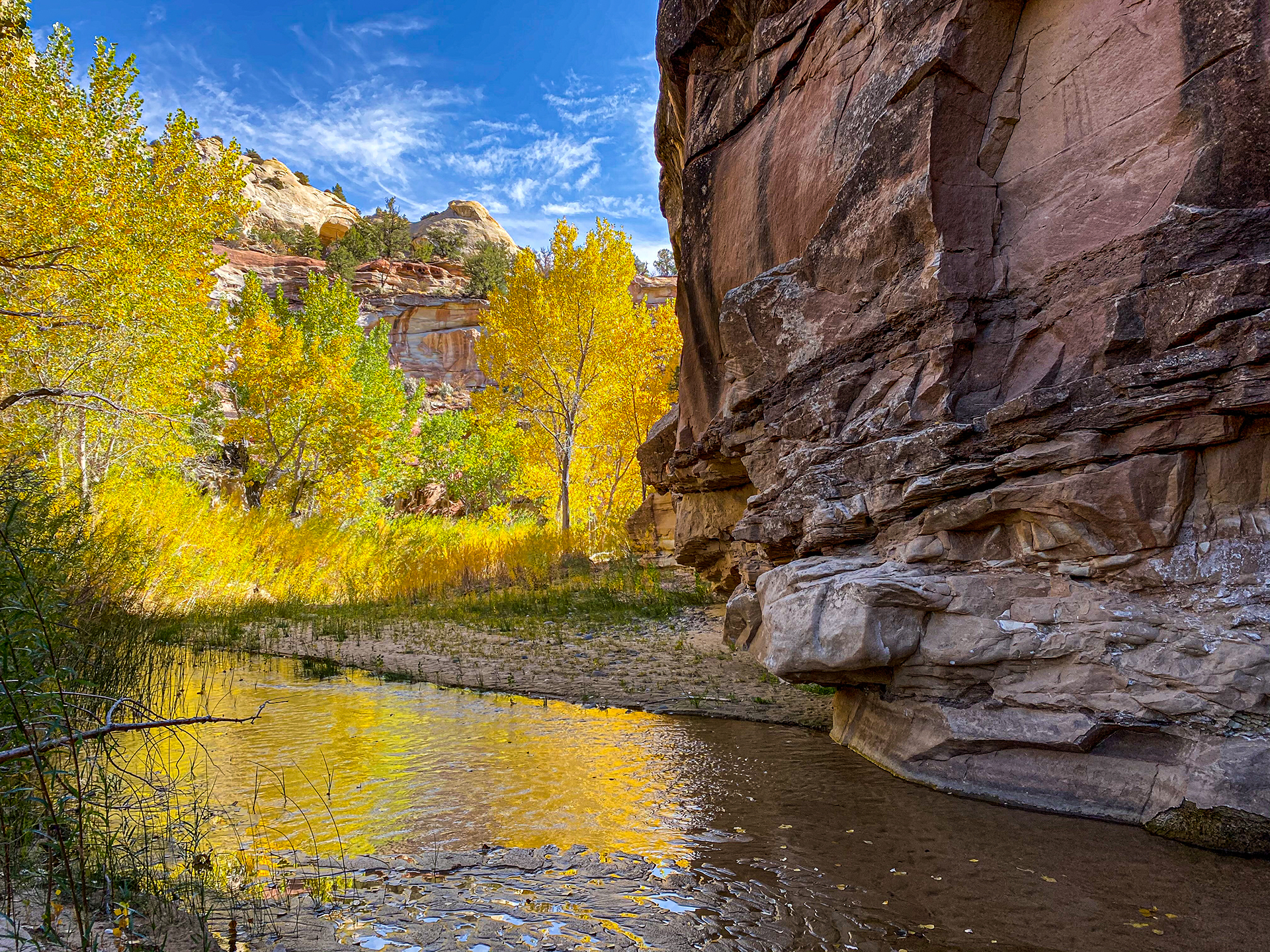 10/20/2020 Wire Pass Slot Canyon and up Buckskin Gulch a short way with Joan. The route was quite crowded on the way out. And there was some horrible vandalism on the petroglyph panel near the junction. A ladder now exists at a difficult rock step. Apparently there have been rescues there recently, so the BLM placed this ladder. But this is a wilderness area so it might be illegal. Certainly it removes my chance of climbing the step. And there is an easy walkaround for those who don’t wish to climb.