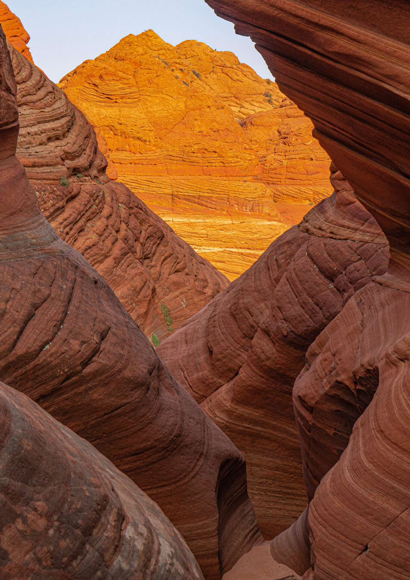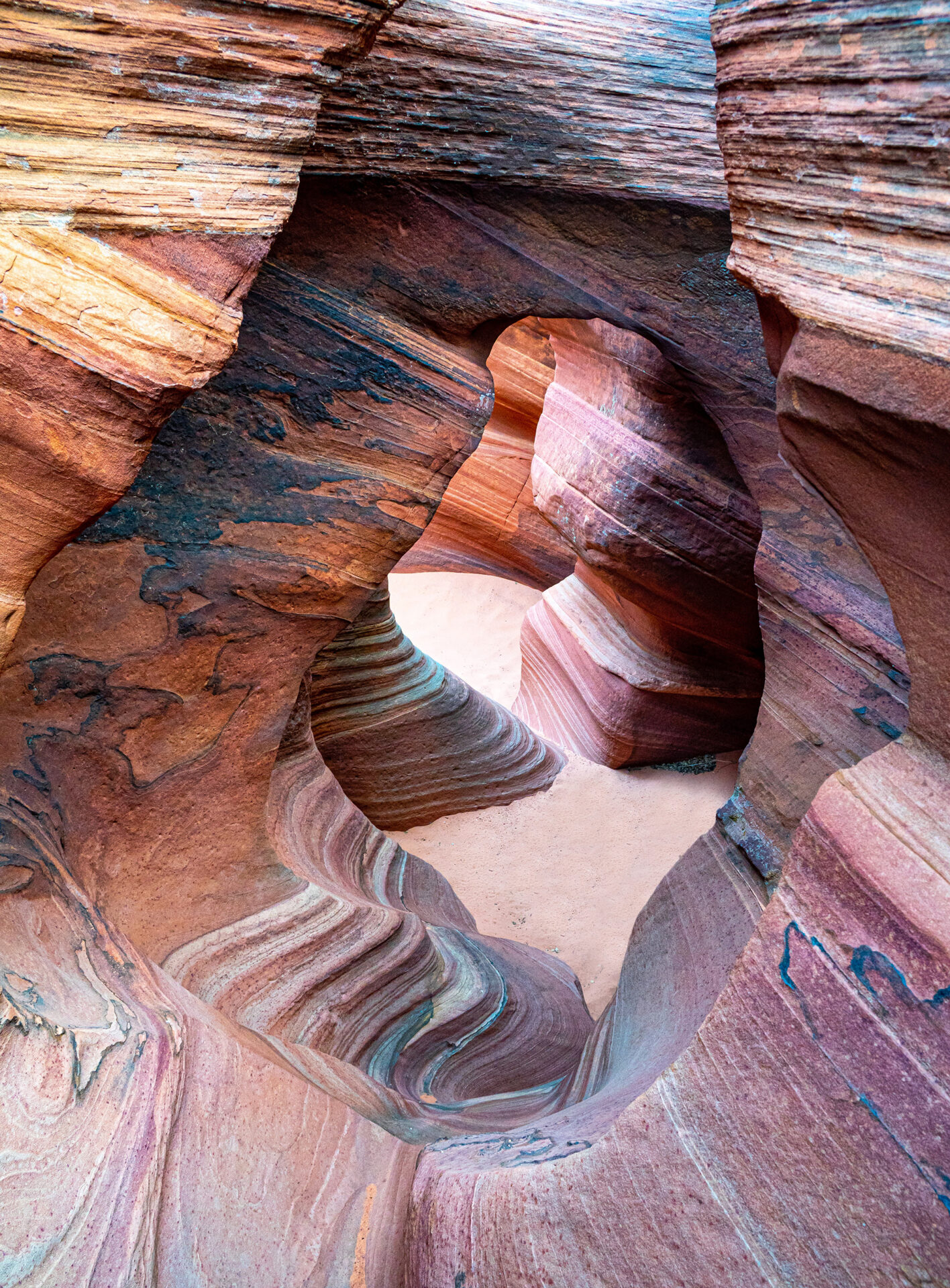 10/22 Solo to Narnia Slot and Arch, and the North Teepees. This was a great day as the terrain was spectacular. About 10 miles in just under six hours. Entering the slot requires a climb up a narrow 8-foot step. I left my pack and tripod behind to make my way up. Then I was able to photograph the arch at the end of the slot and return. Getting to the North Teepees was simple and it was wonderful to photograph the colorful sandstone as I made my way around. It was very windy in the narrow slot to the left of the entrance on the west side. This slot led to the “vortex”. On return I went into Narnia once more, this time with my tripod. But best pics were from earlier.