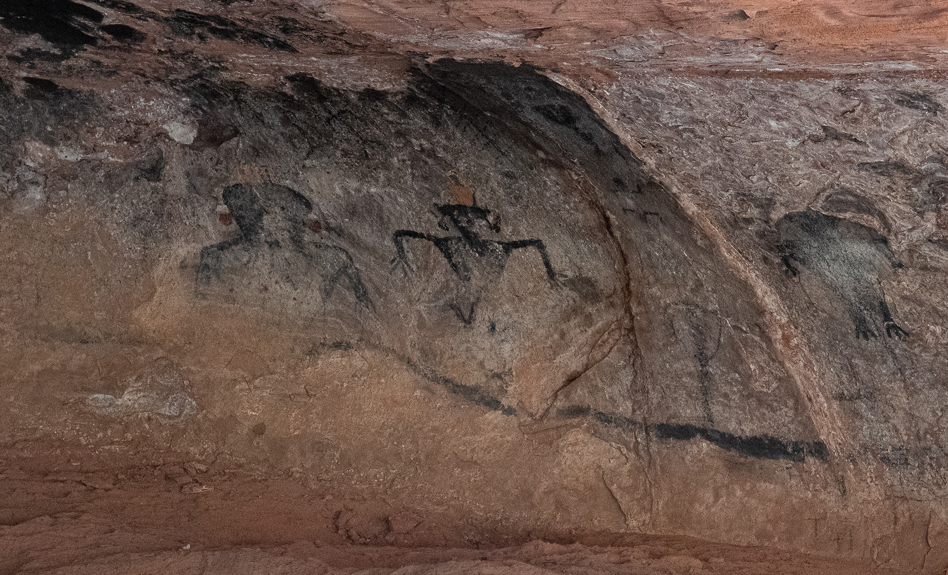 10/23 Mollies Nipple and Starlight Cave, with Kim Clark and guide Paul Gagner. About 10 miles in just under eight hours. After an hour of dirt road driving we easily ascended the 7200-foot peak. Then we went down a long way to the Starlight Cave with its interesting pictographs. On return we went around a nice unnamed butte of Navajo sandstone.