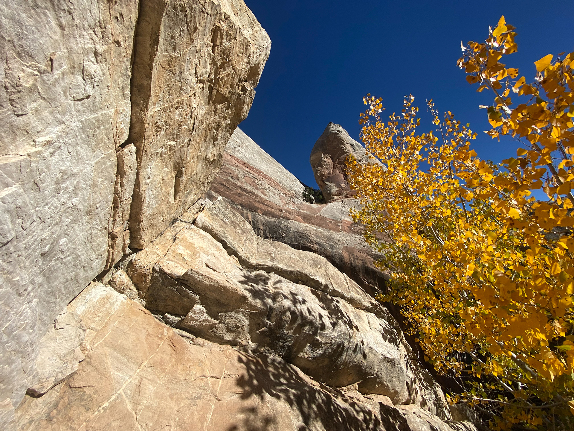 Friday Oct 28. The Castle by a clockwise loop using the slope opposite. Easily found the “Lace Castle” that Jonathan and I failed to find a year ago. Then a descent of steep slabs to get to the main drainage. We found a variant to our last year’s start up the main face on easy slabs. The crux got our attention. Our high point was Castle Rock Arch. We finished the circuit by descending the main drainage. It has a long detour of a pouroff on the left bank, and then a devious 5.2 short climb to avoid the final pouroff. This climb was 30 feet upstream of where we descended last year. Having no rope, we took our time but it was doable without much risk of a slip. I climbed to the halfway point, then Katie climbed to the top and she hauled packs using the carabiner on my pole tether. I stayed at the halfway point to help with the packs. All went well, and it was satisfying to have used this route in both directions. It feels as if no one else uses this route, opting instead for the longer route (in Kelsey’s book) on the SE that avoids the difficulties, but adds a lot of climb. Only about 5 miles, but a difficult and rewarding day. 2800 feet climb.