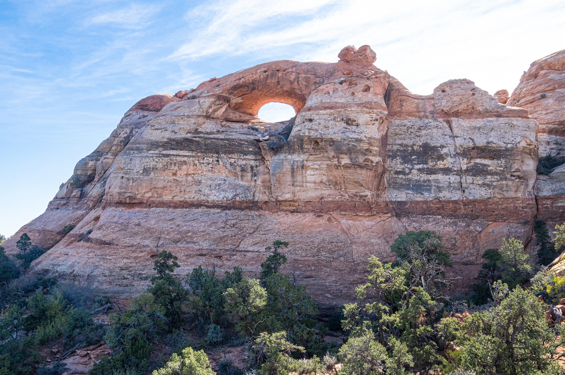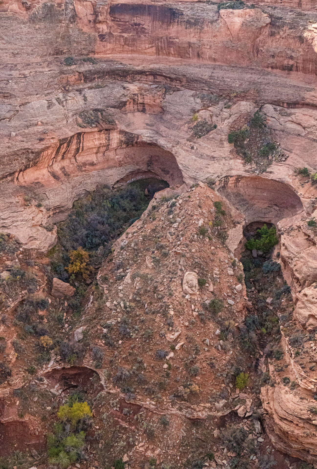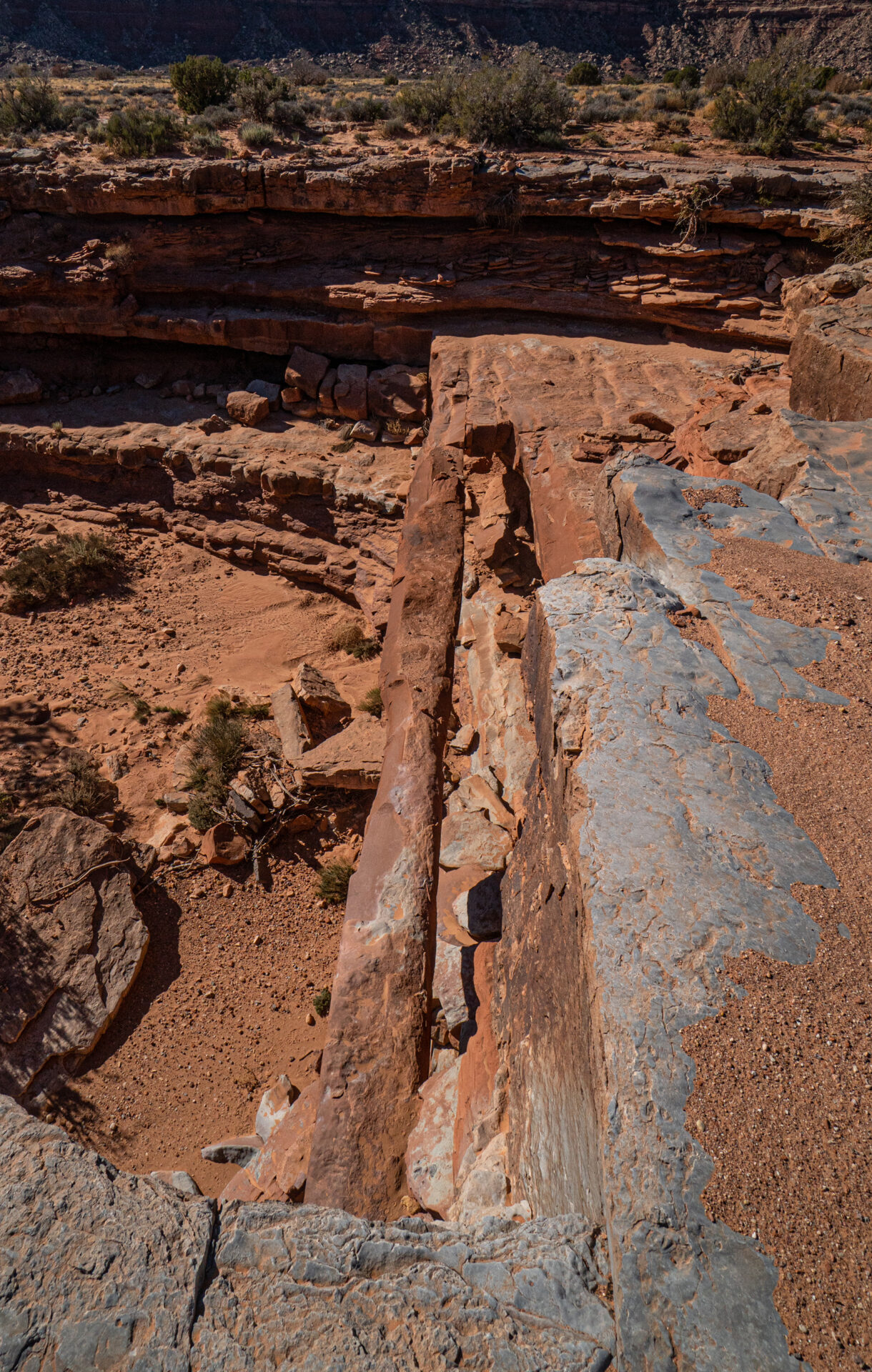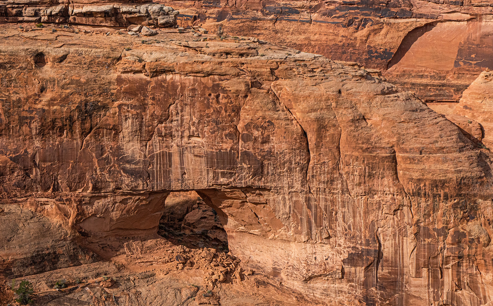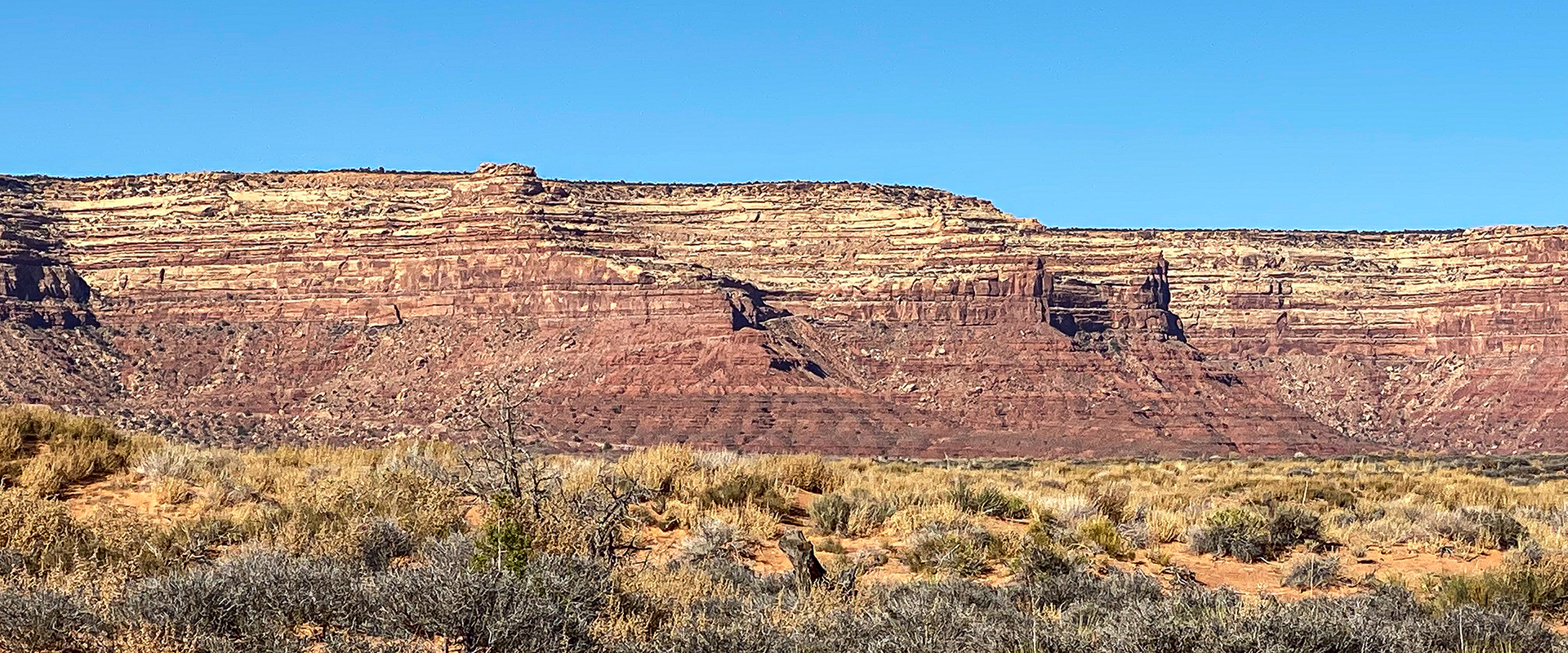 Monday Oct. 31. Joan and I found Red Bar Bridge, a cool feature north of the turn to Goosenecks State Park. We drove 0.9 miles on the dirt road and then walked a straight-line route to the bridge, but that was quite difficult because of very prickly dry tumbleweed. We returned to the car by a slightly longer but much easier route, following the dirt road. Looking at the geology of Goosenecks State Park and also the Mexican Hat balanced rock (which is Cedar Mesa capstone above the Halgaito formation), I will say Red Bar is the Halgaito Formation, the layer underlying the massive Cedar Mesa sandstone. These two are part of the Cutler Group, from the Permian Period.