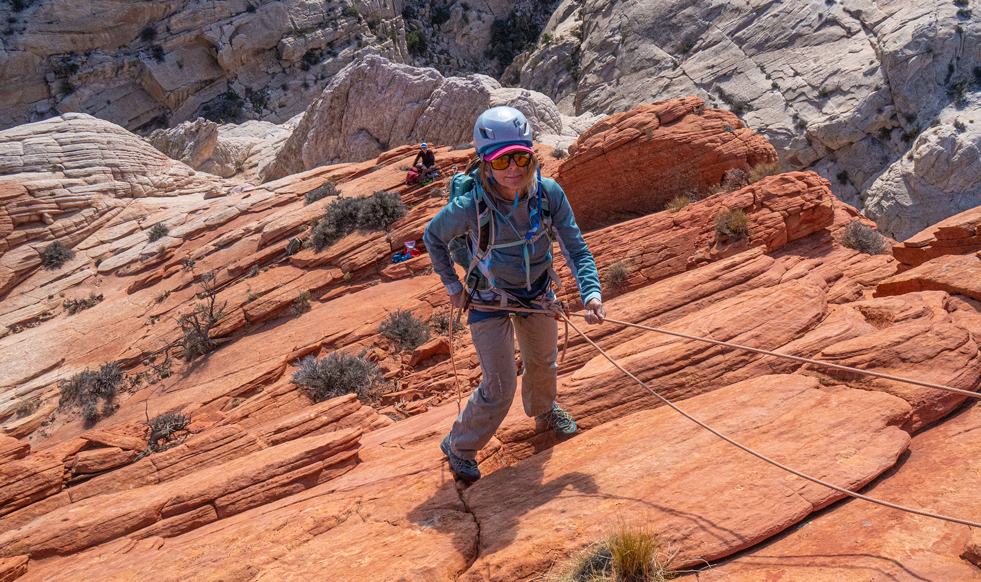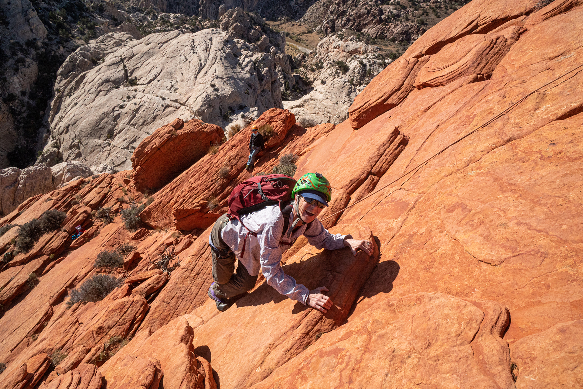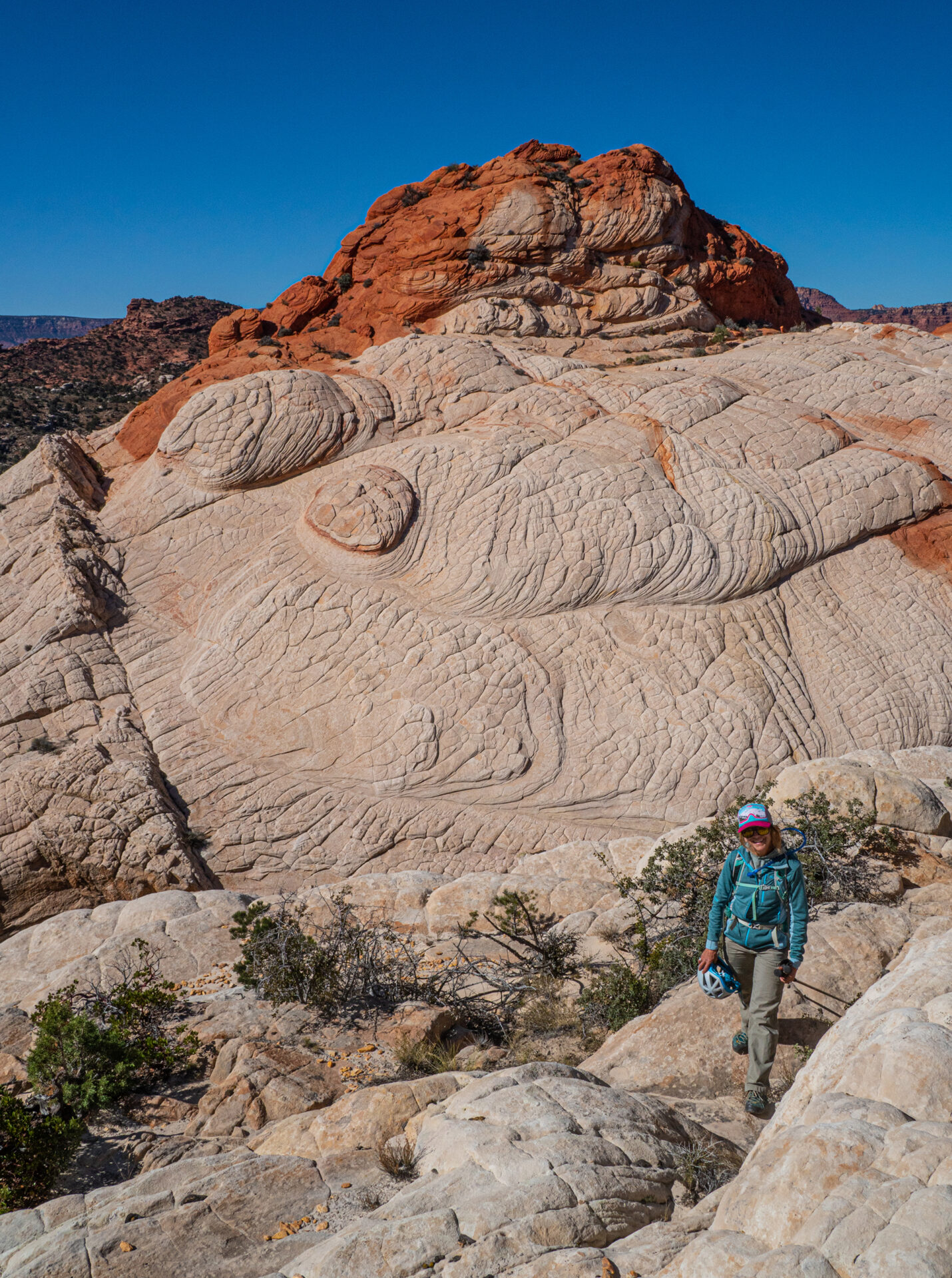 Sunday Oct. 30. Red Top summit with guide Paul Gagner of Dreamland Safari Tours in Kanab. Paul led to the summit and we were belayed for the last pitch. I think the summit is stained Navajo sandstone, though there is some Carmel ss. nearby. The route involves an exposed class 3 slab followed by a 5.2 pitch to the top (rappel on descent). We then crossed the valley to the north and made a devious loop to return to the Red Top area and the trail down to the Paria River. A superb day. 8.2 miles, 2400 feet climb.