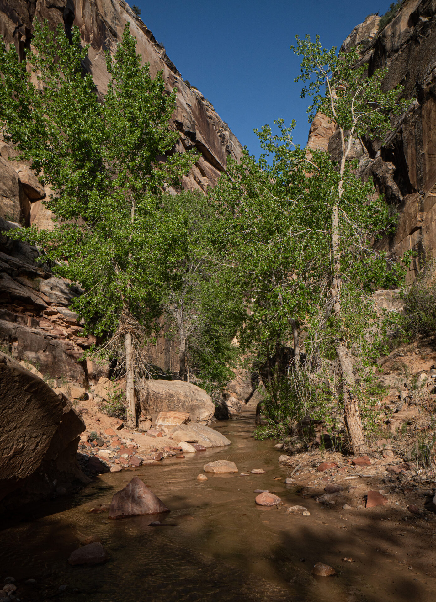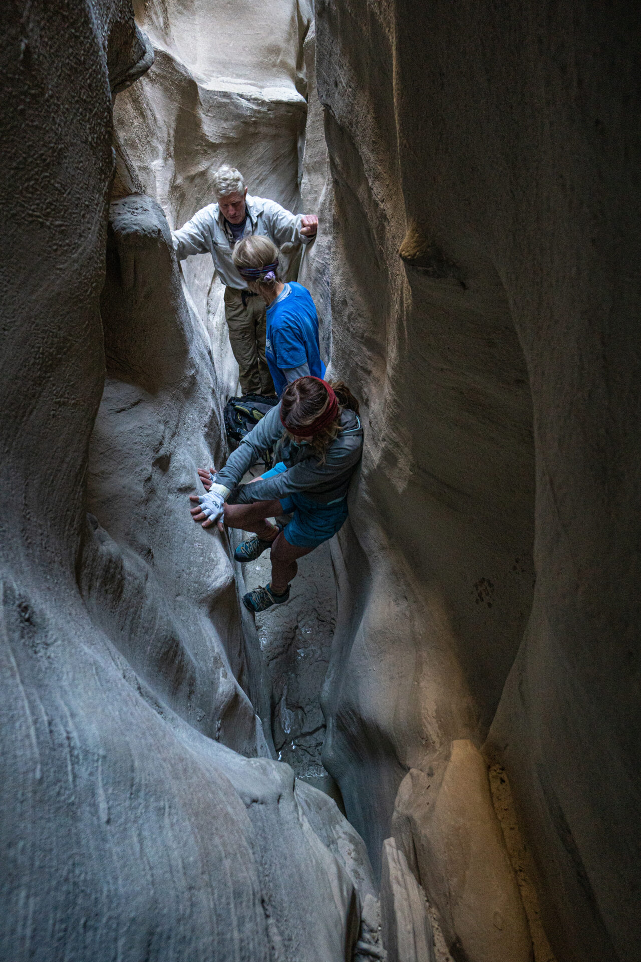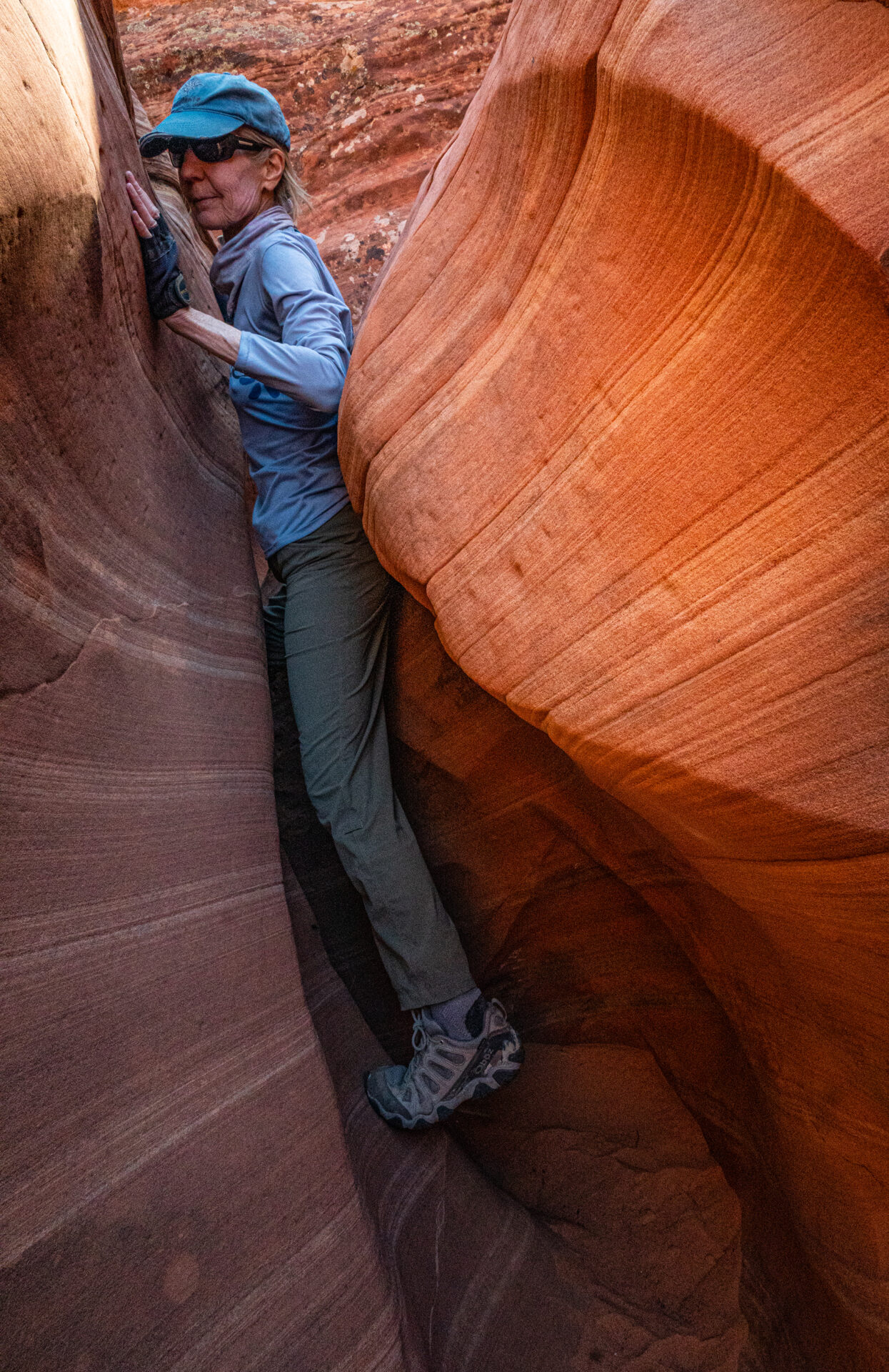 4/19: We quickly got to the tower southwest of the summit of Edmaier’s Knoll, and then climbed the knoll and continued S to descend on the beautiful sandstone. That put us into Buckskin Gulch. Three women on horseback passed us. The climb out of Wire Pass was steep but straightforward and we easily got to beautiful Narnia Slot. The team climbed well through the difficult entrance, but the light in the canyon was not suitable for good photography. One needs to be there early, around 10 am.