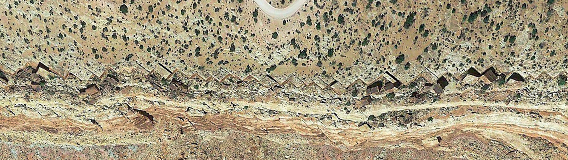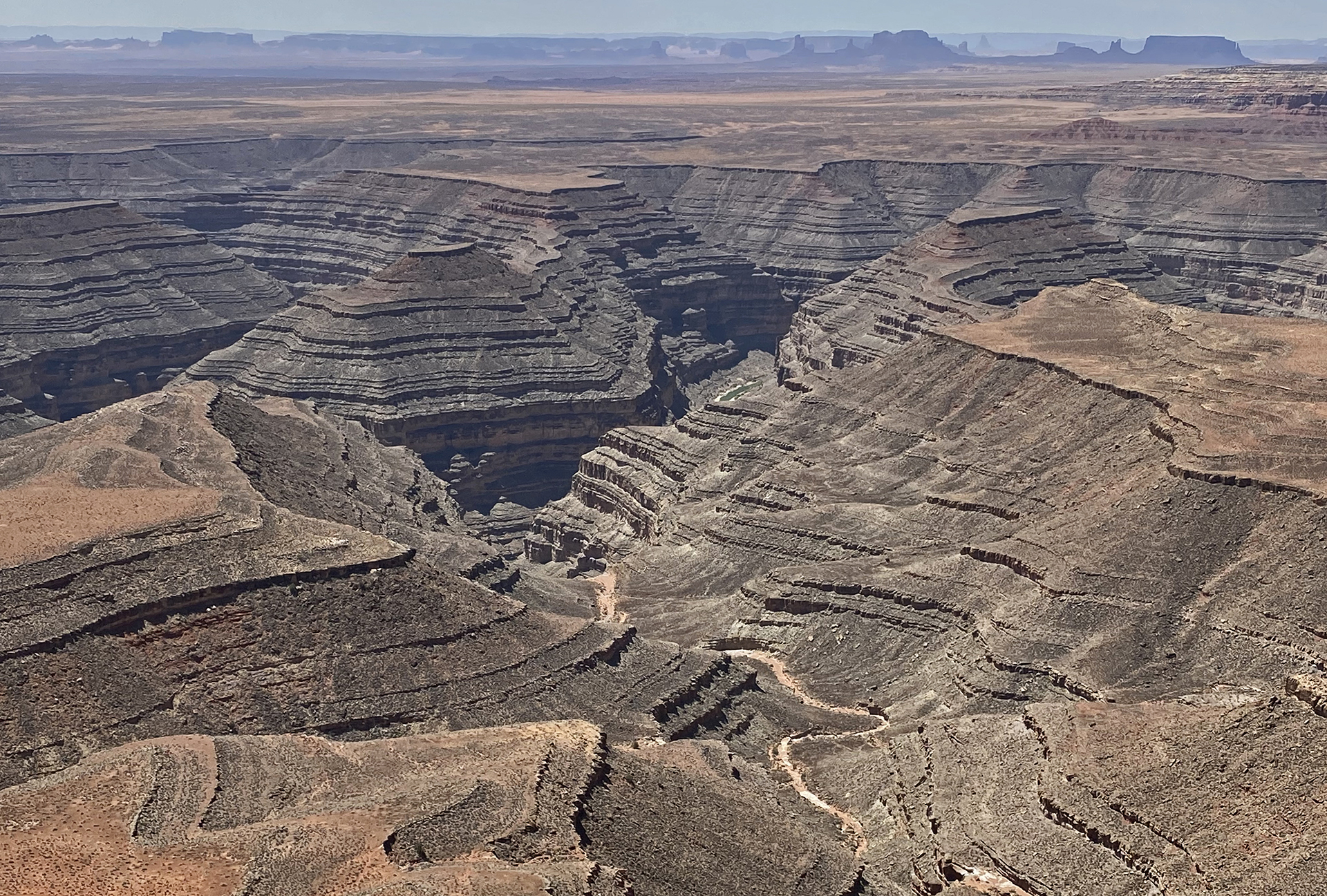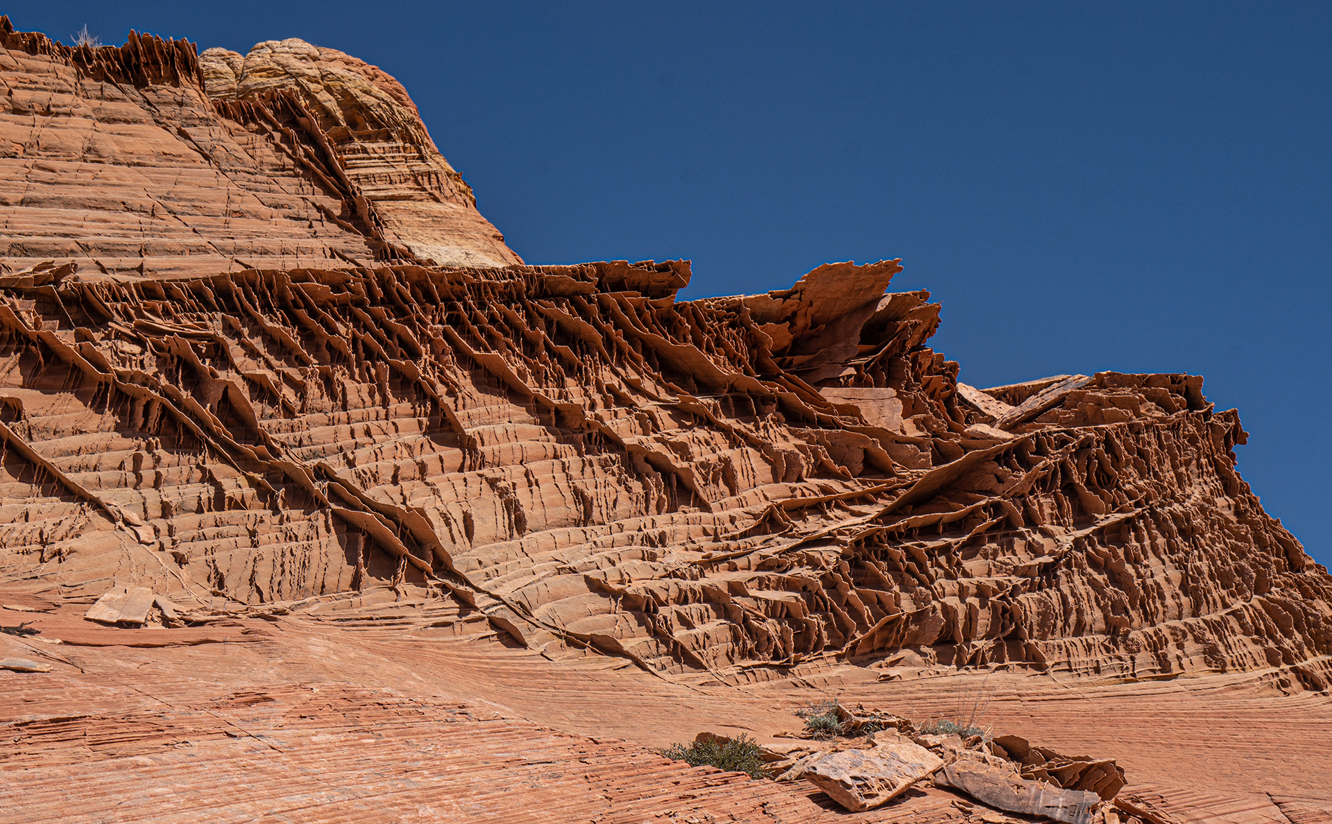 Sidestep Canyon as we start the descent into it.Janet, Elke, and Dave on the fun descent into Sidestep Canyon.The entrance to the Blue Wonder slot.The first climbing step. Note how blue the walls are deep in the canyon; hence the name Blue Wonder.Stan looking up at the crux pitch. The rope was used only for hauling the packs as a couple sections of the slot cannot easily be done with packs on. Photo by Elke Dratch.Dave at the top of the crux. This is a wonderfully photogenic spot. The photographer has to step over the opening from the easy terrain to the right.Looking back from past the crux. The blue color appears in the depths as a reflection of the sky.The formations in this canyon change every year. This year the highlight was this gathering of the Little People. An example of pareidolia!Looking back at Blue Wonder (looker’s right) and the narrow fork (left), which I did in May 2020.Twisted Hoodoo, in the White Rocks area not very far from where we exited Sidestep.An amazing expanse of lace rock (compaction bands) just on the east of the summit of the main knoll in Edmaier’s Secret.Approaching the southwest side of the main knoll, which leads to the remarkable tower below.Extreme example of free-standing compaction bands in the Navajo sandstone. More details on such things is at: Richard A. Schultz, Chris H. Okubo, and Haakon Fossen, Porosity and grain size controls on compaction band formation in Jurassic Navajo Sandstone, Geophysical Research Letters, 37:22, 2010; available at https://www.researchgate.net/publication/228665063_Porosity_and_grain_size_controls_on_compaction_band_formation_in_Jurassic_Navajo_Sandstone.The route from the tower to the summit leads past some nice deformed sandstone.Dave resting on the descent into Buckskin.Aliens?The strenuous entry into Narnia slot.Light was not ideal, but the slot was beautiful.Janet descending the Narnia entrance.The highlight of this day was this remarkable Sandstone Curtain. It is very thin and fragile. How long has it been in this formation, one wonders. I have seen a lot of lace rock, but never something quite like this. It appears that a thin band of more-compacted sand forms and when the material is compressed into stone, that section becomes a more resistant thin band and so erodes more slowly.This feature gained fame recently when it was used by Apple as the basis for the screensaver on the iPhone.Another great wall.White Pocket Butte. We climbed it via the right-hand skyline. Class 3 if one finds the easiest way.A rose.This top layer of sandstone gives the White Pocket area its name.The swan.Heagonal or pentagonal forms are common in the Navajo sandstone. Here the small Moki marbles have rolled into the seams, highlighting them.This was taken on our return to Yellow Rock on the ridge line to its south.The Tower of Silence with the distinctive rivulets of the Gunsight Butte member of Entrada sandstone. The caprock is Dakota sandstone.An unusually angled caprock. This is in the canyon just before the one with the Tower of Silence.The Tower of Silence viewed from the canyon rim; Wahweap Creek in background.Our route in took us by Castle Rock, which has an easy route to the top. Future exploration needed. (Edit: Climbed it twice.)My new wide-angle lens made it easy to get a good shot from inside Sam Pollock Arch. Sam Pollock was the mastermind behind the Cottonwood Narrows Road, which was built in 1957 to connect the Bryce region to Page. I am hopeful this will make the cover of SPAN, the journal of the Natural Arch and Bridge Society, and that is why I focused on a vertical shot.The front of the arch.The well preserved Frank Watson Cabin. Our route into Hackberry was an intricate one down the steep canyon just above the chimney. Note the cacti growing out of the roof.Our return to the road was via Hackberry Canyon which ends in a great section of narrows. The stream is perennial, but the flow was low so walking in the water was very easy.View of the goosenecks of the San Juan River with Monument Valley in rear. This is from a location about 3 miles east of the top of the Moki Dugway. Here the river is flowing from left to right, to reach Lake Powell and the Colorado just upstream of Rainbow Bridge.From our lookout spot we could see these blocks falling off the main cliff. This extended a long a way and the blocks were remarkably homogenous in size and angle, making a clear zig-zag pattern on the edge.The straight joint lines extend back into the formation. This is a Google Earth image. Maybe this is Cedar Mesa Sandstone. Below is an image from Google Earth which shows the fallen blocks and the almost exact sawtooth pattern formed in the area they fell from. It appears that the faults here run back to the upper left, though I cannot see them running to the upper right which would seem to be required for the square shapes being cut out.The rectilinear tiling is clear.A view of Upheaval Dome from a point about a mile counterclockwise from the parking lot.