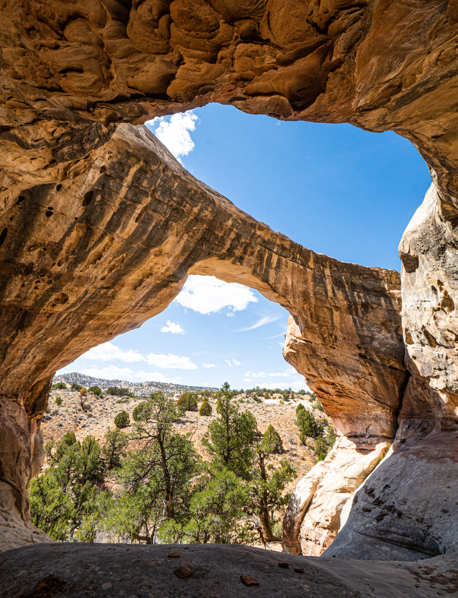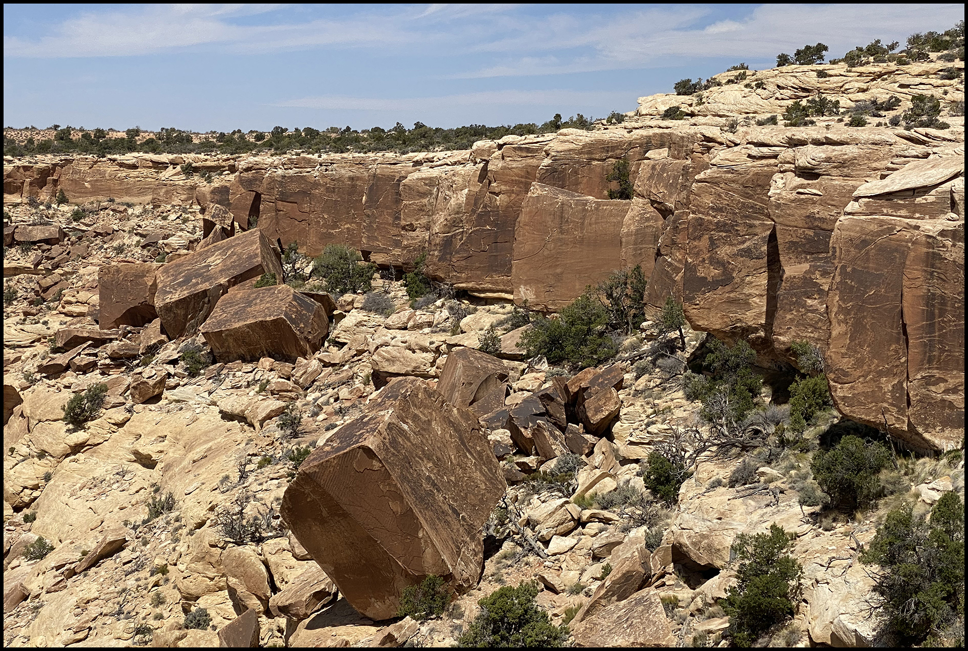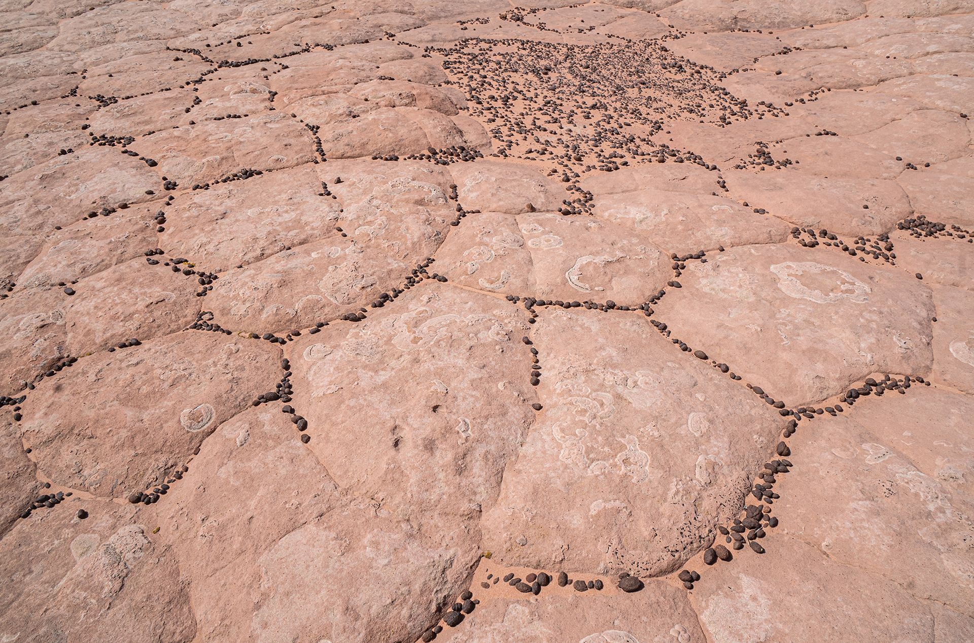 Sidestep Canyon as we start the descent into it.Janet, Elke, and Dave on the fun descent into Sidestep Canyon.The entrance to the Blue Wonder slot.The first climbing step. Note how blue the walls are deep in the canyon; hence the name Blue Wonder.Stan looking up at the crux pitch. The rope was used only for hauling the packs as a couple sections of the slot cannot easily be done with packs on. Photo by Elke Dratch.Dave at the top of the crux. This is a wonderfully photogenic spot. The photographer has to step over the opening from the easy terrain to the right.Looking back from past the crux. The blue color appears in the depths as a reflection of the sky.The formations in this canyon change every year. This year the highlight was this gathering of the Little People. An example of pareidolia!Looking back at Blue Wonder (looker’s right) and the narrow fork (left), which I did in May 2020.Twisted Hoodoo, in the White Rocks area not very far from where we exited Sidestep.An amazing expanse of lace rock (compaction bands) just on the east of the summit of the main knoll in Edmaier’s Secret.Approaching the southwest side of the main knoll, which leads to the remarkable tower below.Extreme example of free-standing compaction bands in the Navajo sandstone. More details on such things is at: Richard A. Schultz, Chris H. Okubo, and Haakon Fossen, Porosity and grain size controls on compaction band formation in Jurassic Navajo Sandstone, Geophysical Research Letters, 37:22, 2010; available at https://www.researchgate.net/publication/228665063_Porosity_and_grain_size_controls_on_compaction_band_formation_in_Jurassic_Navajo_Sandstone.The route from the tower to the summit leads past some nice deformed sandstone.Dave resting on the descent into Buckskin.Aliens?The strenuous entry into Narnia slot.Light was not ideal, but the slot was beautiful.Janet descending the Narnia entrance.The highlight of this day was this remarkable Sandstone Curtain. It is very thin and fragile. How long has it been in this formation, one wonders. I have seen a lot of lace rock, but never something quite like this. It appears that a thin band of more-compacted sand forms and when the material is compressed into stone, that section becomes a more resistant thin band and so erodes more slowly.This feature gained fame recently when it was used by Apple as the basis for the screensaver on the iPhone.Another great wall.White Pocket Butte. We climbed it via the right-hand skyline. Class 3 if one finds the easiest way.A rose.This top layer of sandstone gives the White Pocket area its name.The swan.Heagonal or pentagonal forms are common in the Navajo sandstone. Here the small Moki marbles have rolled into the seams, highlighting them.This was taken on our return to Yellow Rock on the ridge line to its south.The Tower of Silence with the distinctive rivulets of the Gunsight Butte member of Entrada sandstone. The caprock is Dakota sandstone.An unusually angled caprock. This is in the canyon just before the one with the Tower of Silence.The Tower of Silence viewed from the canyon rim; Wahweap Creek in background.Our route in took us by Castle Rock, which has an easy route to the top. Future exploration needed. (Edit: Climbed it twice.)My new wide-angle lens made it easy to get a good shot from inside Sam Pollock Arch. Sam Pollock was the mastermind behind the Cottonwood Narrows Road, which was built in 1957 to connect the Bryce region to Page. I am hopeful this will make the cover of SPAN, the journal of the Natural Arch and Bridge Society, and that is why I focused on a vertical shot.The front of the arch.The well preserved Frank Watson Cabin. Our route into Hackberry was an intricate one down the steep canyon just above the chimney. Note the cacti growing out of the roof.Our return to the road was via Hackberry Canyon which ends in a great section of narrows. The stream is perennial, but the flow was low so walking in the water was very easy.View of the goosenecks of the San Juan River with Monument Valley in rear. This is from a location about 3 miles east of the top of the Moki Dugway. Here the river is flowing from left to right, to reach Lake Powell and the Colorado just upstream of Rainbow Bridge.From our lookout spot we could see these blocks falling off the main cliff. This extended a long a way and the blocks were remarkably homogenous in size and angle, making a clear zig-zag pattern on the edge.The straight joint lines extend back into the formation. This is a Google Earth image. Maybe this is Cedar Mesa Sandstone. Below is an image from Google Earth which shows the fallen blocks and the almost exact sawtooth pattern formed in the area they fell from. It appears that the faults here run back to the upper left, though I cannot see them running to the upper right which would seem to be required for the square shapes being cut out.The rectilinear tiling is clear.A view of Upheaval Dome from a point about a mile counterclockwise from the parking lot.