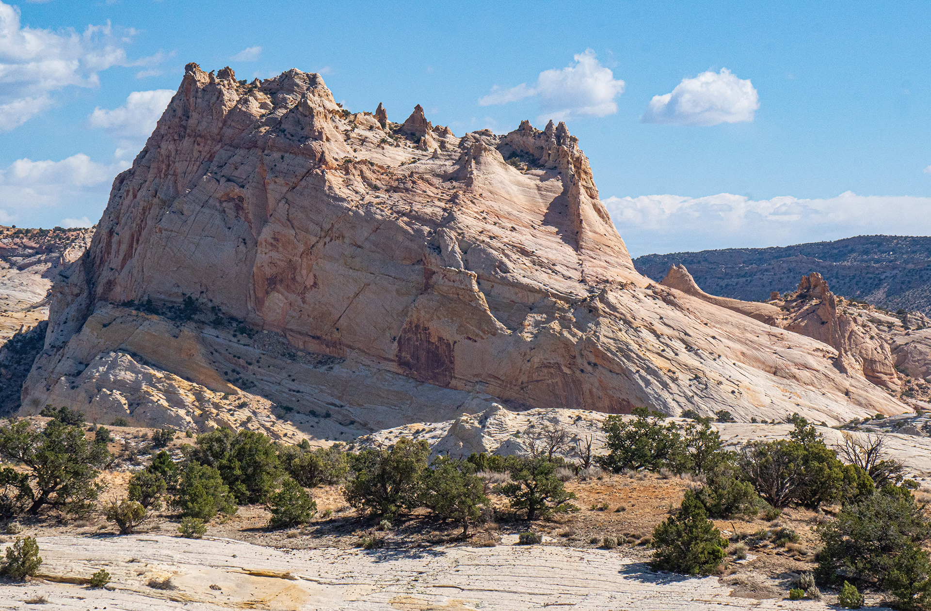 4/20: Elke and I met guide Paul Gagner (Dreamland Safari tours) and did the very long drive to the White Pocket. This has become a popular place and deservedly so as there are so many interesting features. After seeing the usual sights near the parking lot we headed up White Pocket Butte and climbed it by a devious class-3 route.