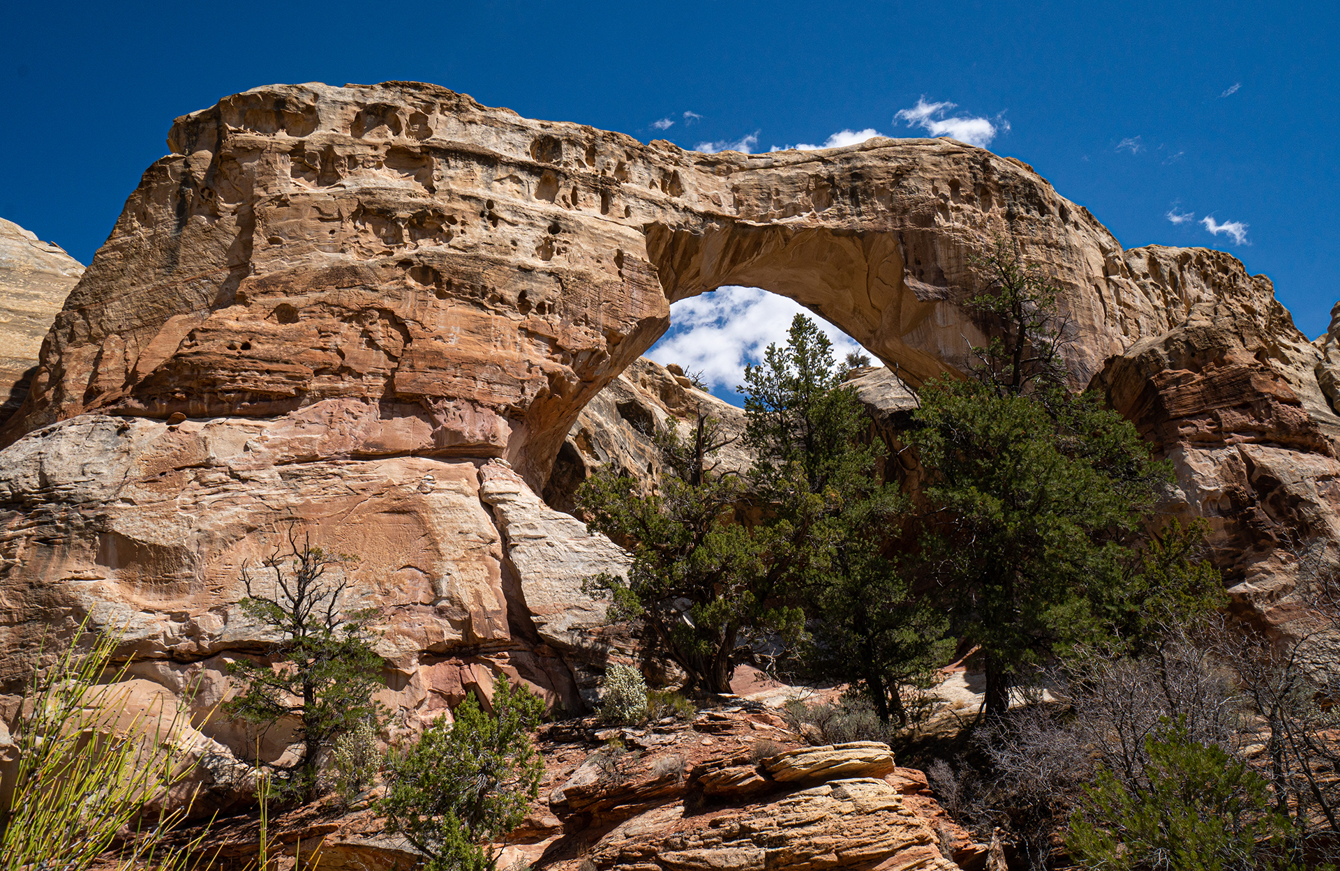 4/23. Big day: We started at the Goulding Trail TH and took, roughly, that trail to Point 5770, and then down to the steep canyon containing Moki House, and then down to the Watson Cabin in Hackberry Canyon. Then up-canyon and left to Sam Pollock Arch. Return to the Hackberry TH and walk a mile on the road to the car. 15+ miles. 9+ hours.