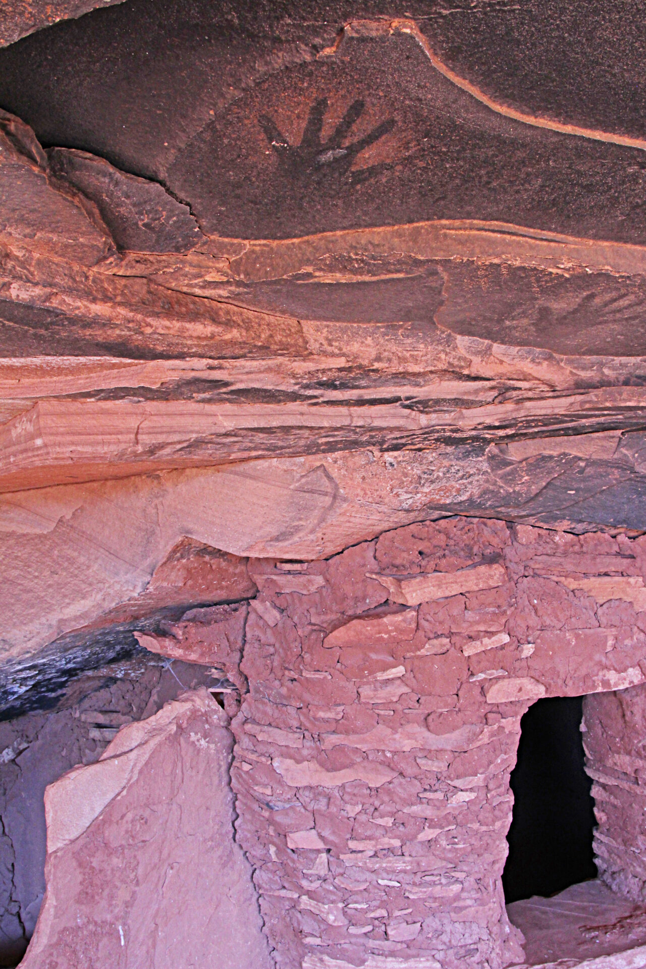 Oct. 27, 2017. To Mule Canyon for House on Fire and then Road Canyon for Fallen Roof Ruin. The first was a 2-mile round trip and we had it to ourselves. The second was a 2.5-mile round trip, and again, we had it to ourselves. These small ruins are superb, and likely among the best in the region for photography. At Fallen Roof I made a 17-frame panorama that captures the whole scene, including the three black hands at the left, and it came out extremely well.