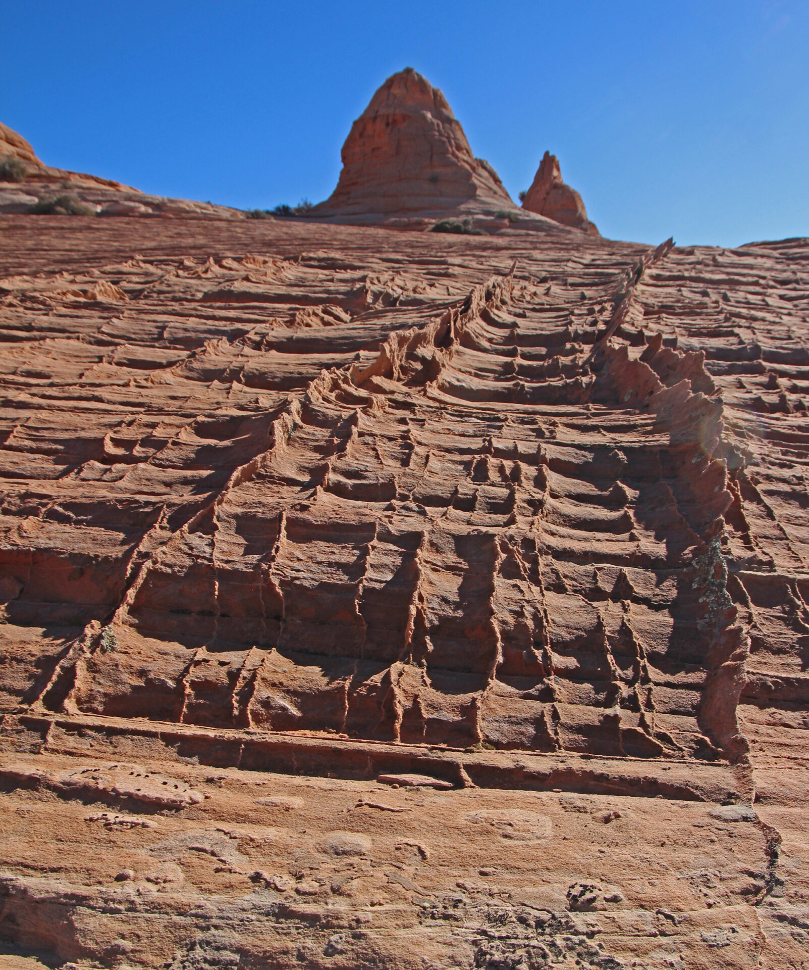 Oct. 23, 2017. Grand Junction to Page, Arizona, Best Western View Motel. Internet service throughout Page is really awful, making map downloading, etc., almost impossible. Bill and Elaine Belvin and I did a short afternoon hike along the north Rim of Waterholes Canyon. We got to what Bill calls “The Great Wall”, an interesting feature. This area requires an easily obtained Navajo permit.