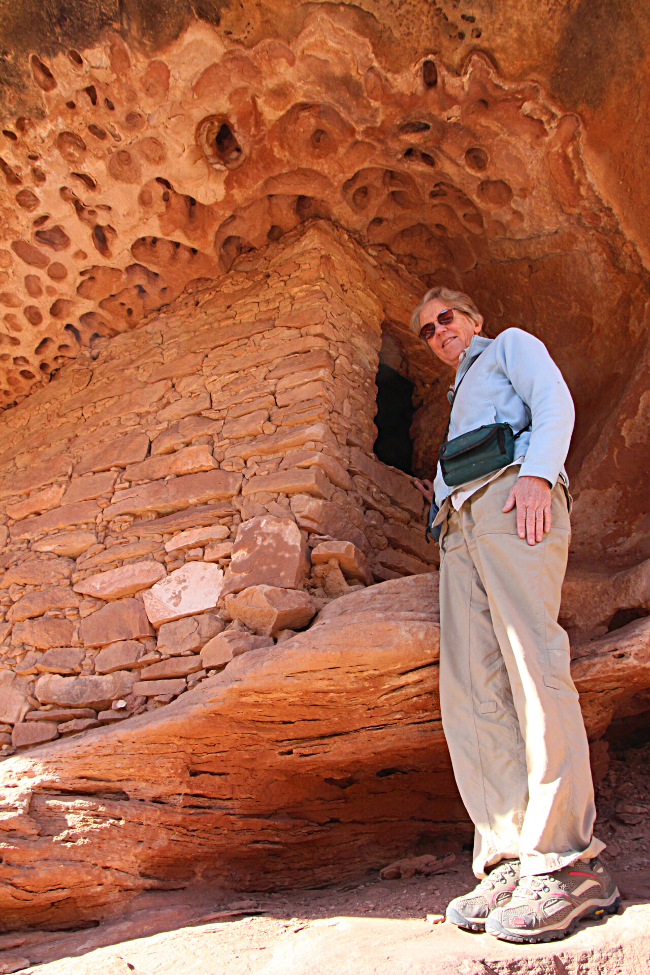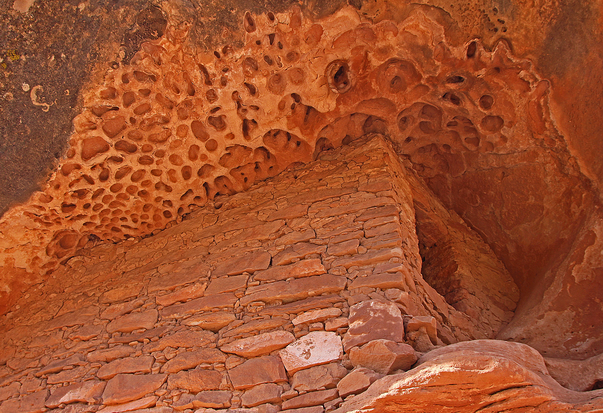As we left Blanding for Hovenweep National Monument and the return home, we first visited Montezuma Canyon to search for the Honeycomb Roof Ruin. Tafoni usually forms on vertical walls, so I wonder if this formed on a giant boulder that fell into this position.