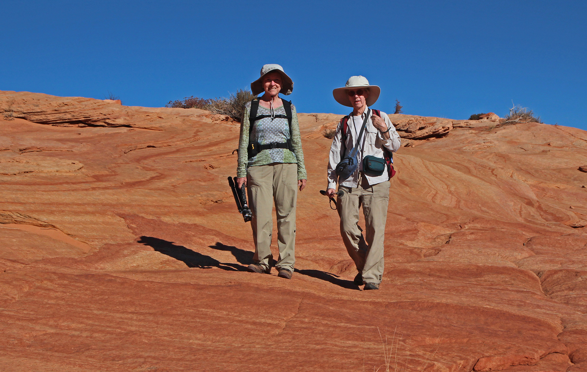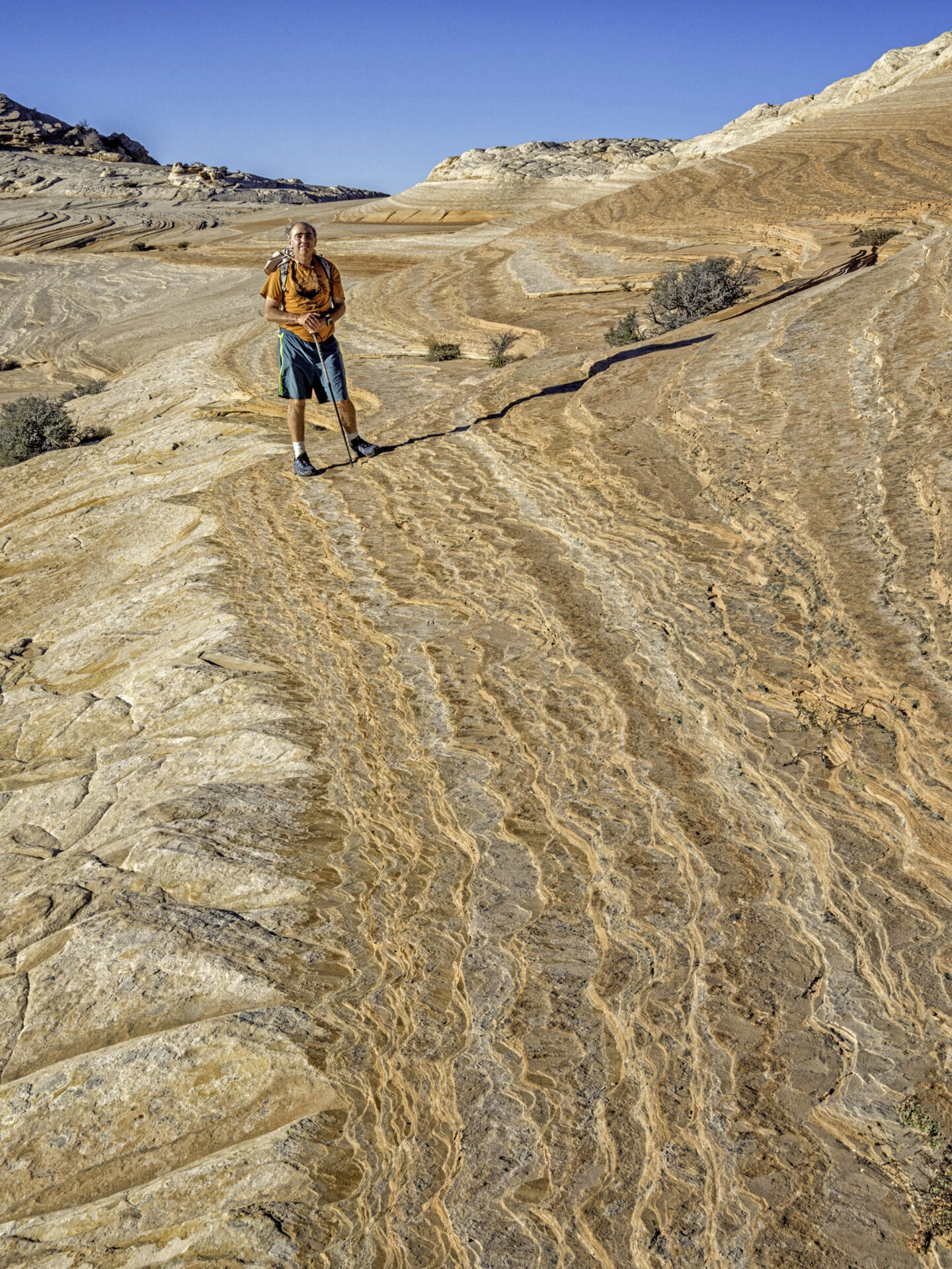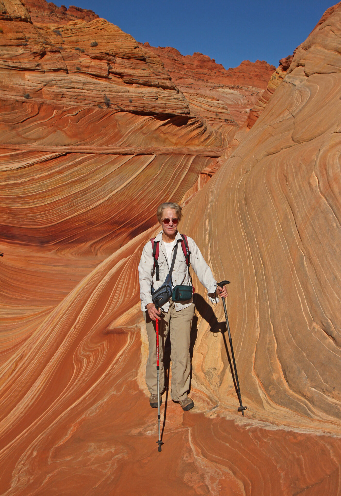 Oct. 24, 2017. The Wave, 7 miles. 6 hours. Bill, Elaine, Stan, Joan. Superb hike, as expected, with great photography. My best shot is a panorama made from eight frames. We wandered a bit south of the Wave to see the Second Wave. On return we spent time photographing some domes just before the first steep descent. There is so much to see here at North Coyote Buttes that I hope to return.