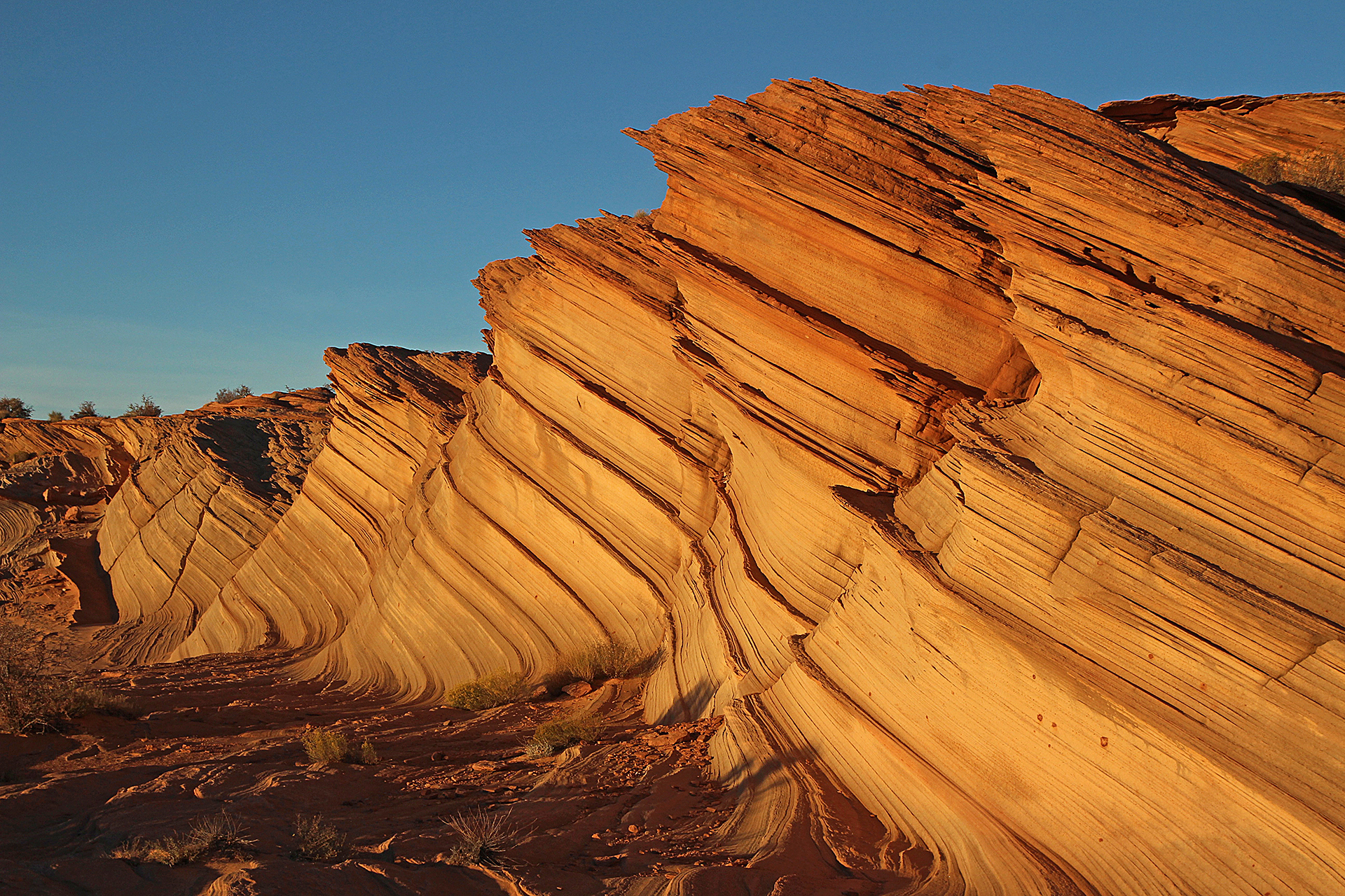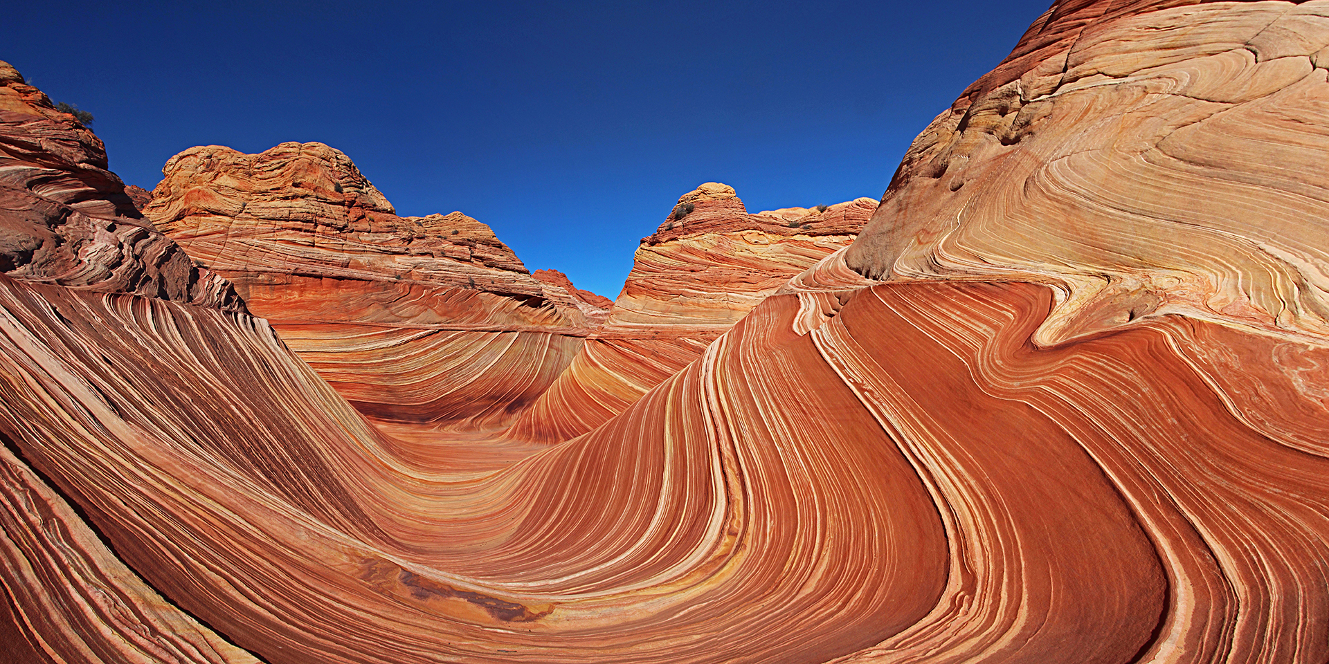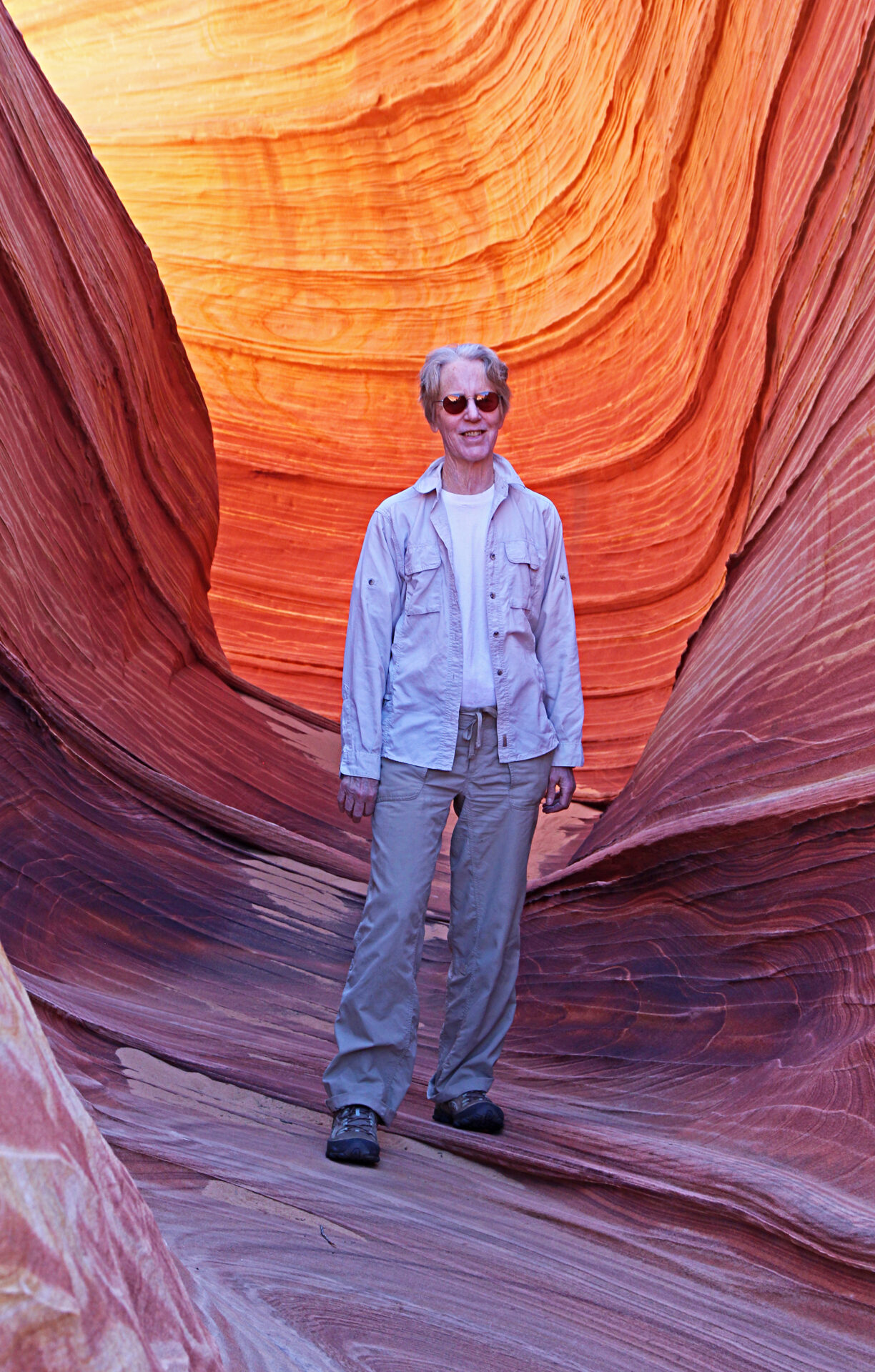 Oct. 24, 2017. The Wave, 7 miles. 6 hours. Bill, Elaine, Stan, Joan. Superb hike, as expected, with great photography. My best shot is a panorama made from eight frames. We wandered a bit south of the Wave to see the Second Wave. On return we spent time photographing some domes just before the first steep descent. There is so much to see here at North Coyote Buttes that I hope to return.