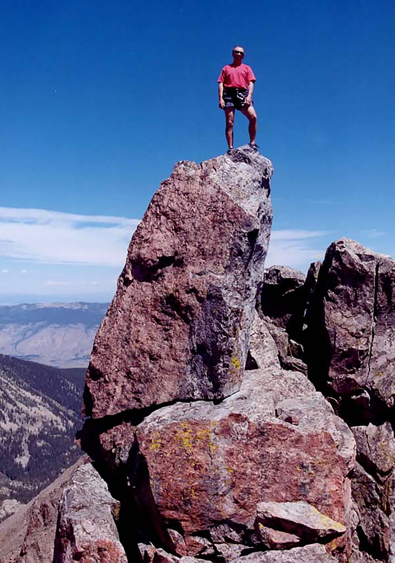 In July 2002 I and two others hiked to Peak T (while doing peaks T, S, and R) and noted the (detached!) summit block that was steep on all sides. We climbed the easier high point (background of photo of summit block), but it was clear that the block was a few feet higher. On August 25, 2002, I returned with Joe Kramarsic and Jim Koegel, and a rope and rock shoes. We threw the rope over the block to set up a belay and climbed it by a couple of routes. To finish we all climbed it without the rope. The easiest is the southwest corner (5.5; face and right side of photo). The northeast corner offered a 5.8 route. It was a long day, as the approach from Boulder Lake trailhead makes this a 22-mile roundtrip. The approach to tree line via the broad gully from Upper Slate Lake is very pleasant.