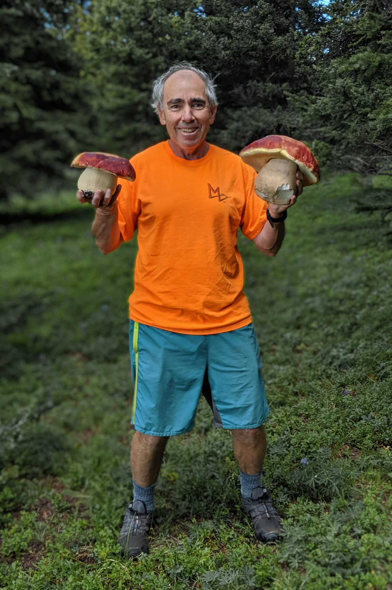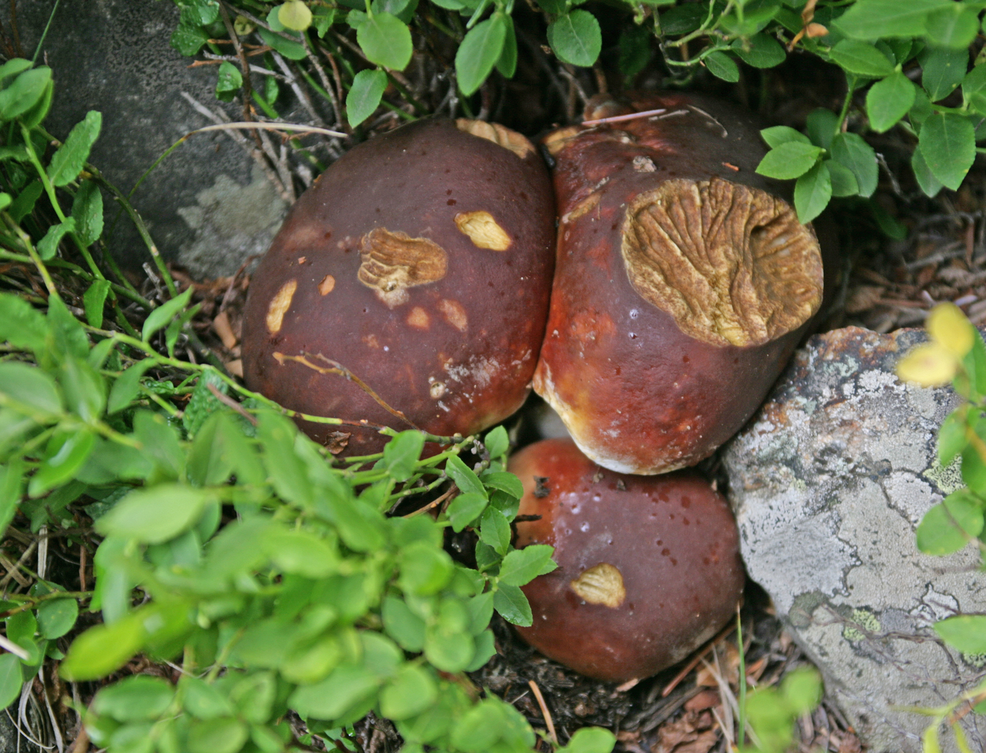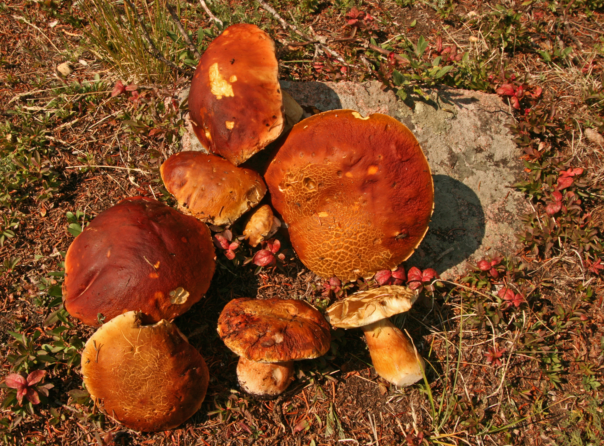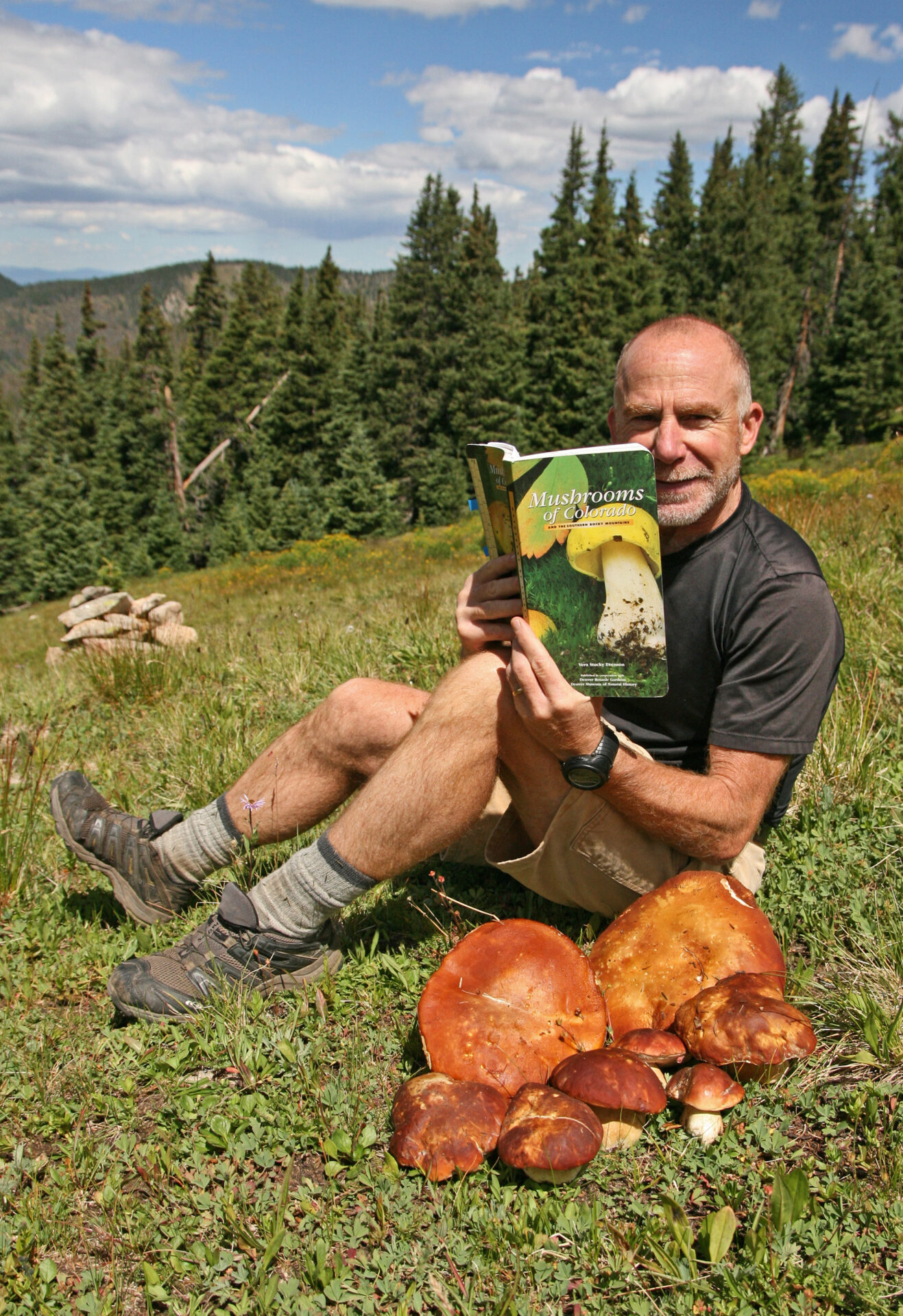 This fairy circle of porcini was so beautiful I did not disturb it.Close-up of preceding.Two perfect specimensAlmost four and a half pounds!The preceding large specimen was as perfect on the inside as on the outside.Jonathan Kriegel. We no longer need guidebooks to identify porcini.Pushing up a log.Pushing up a rock; hence “stein-liz”.My nephew Rudi Brooks, and his wife Juli.Amanita mascara indicated porcini are close. Not always this close!My brother-in-law John HutchinsonFound with my nephew Rudi.Marks of a bear.A 14-inch diameter porcino.