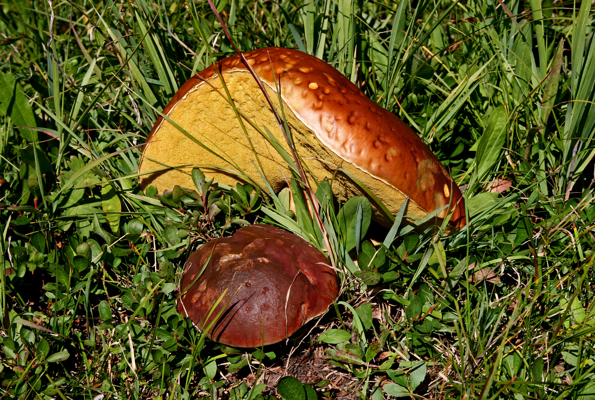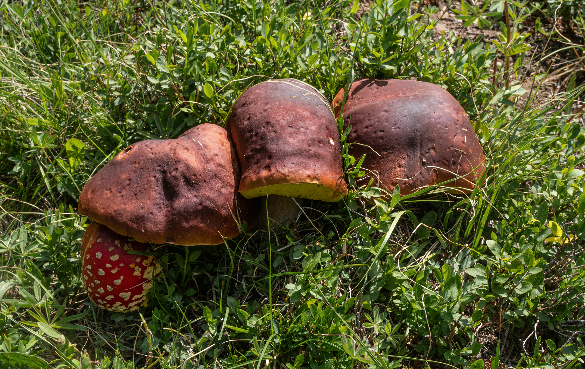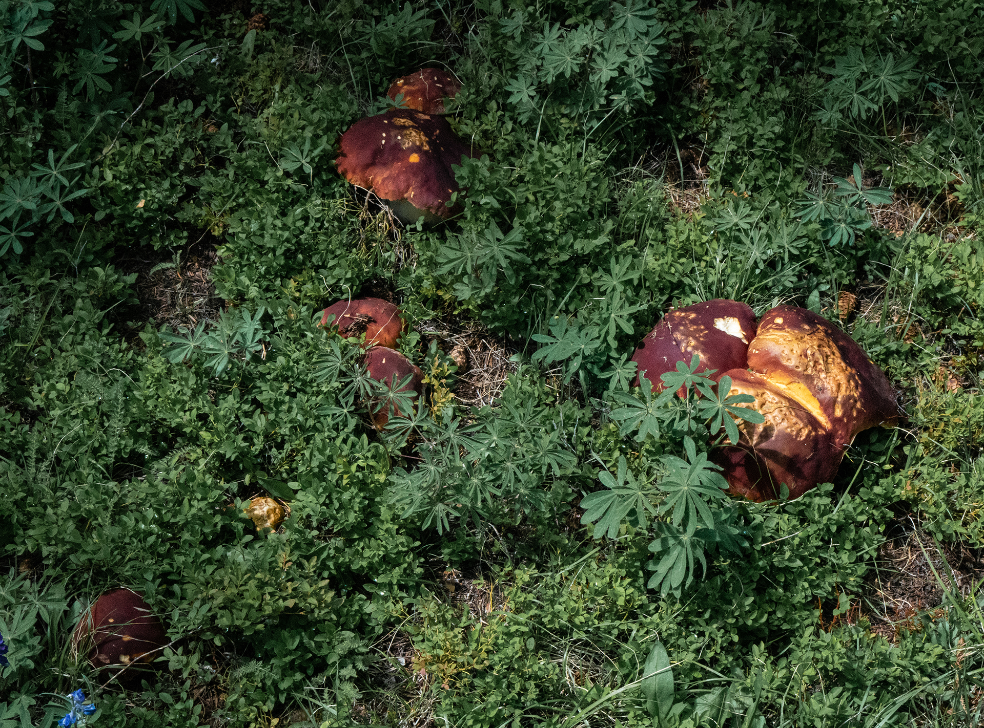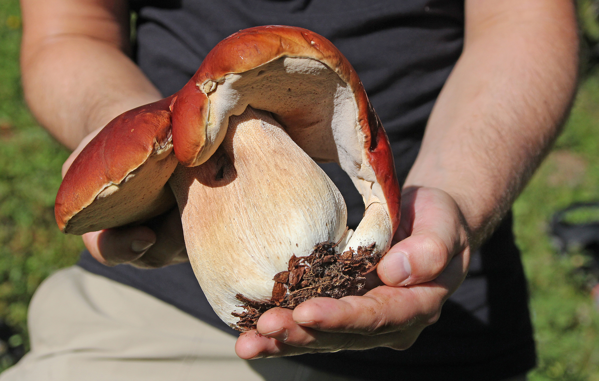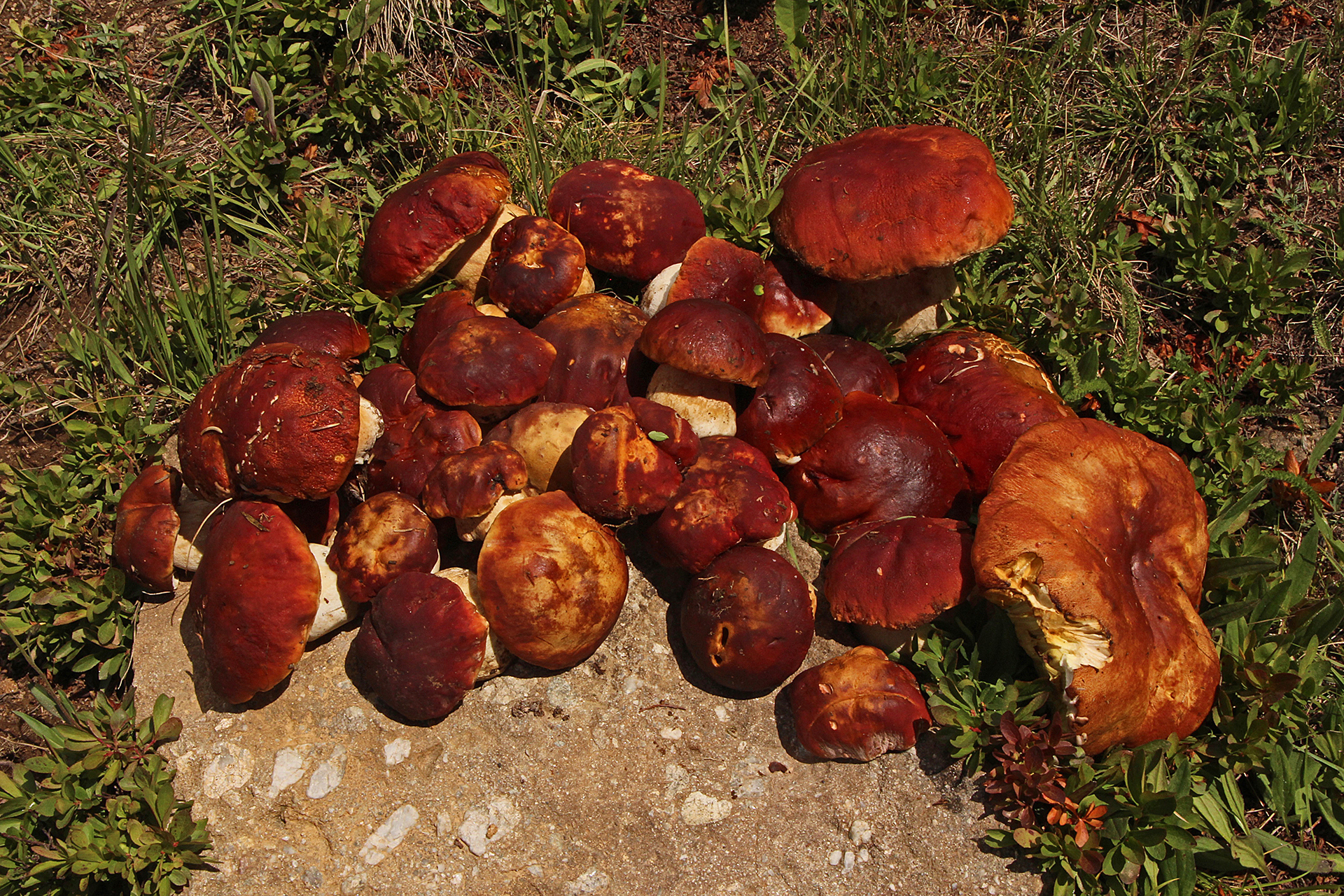 This fairy circle of porcini was so beautiful I did not disturb it.Close-up of preceding.Two perfect specimensAlmost four and a half pounds!The preceding large specimen was as perfect on the inside as on the outside.Jonathan Kriegel. We no longer need guidebooks to identify porcini.Pushing up a log.Pushing up a rock; hence “stein-liz”.My nephew Rudi Brooks, and his wife Juli.Amanita mascara indicated porcini are close. Not always this close!My brother-in-law John HutchinsonFound with my nephew Rudi.Marks of a bear.A 14-inch diameter porcino.