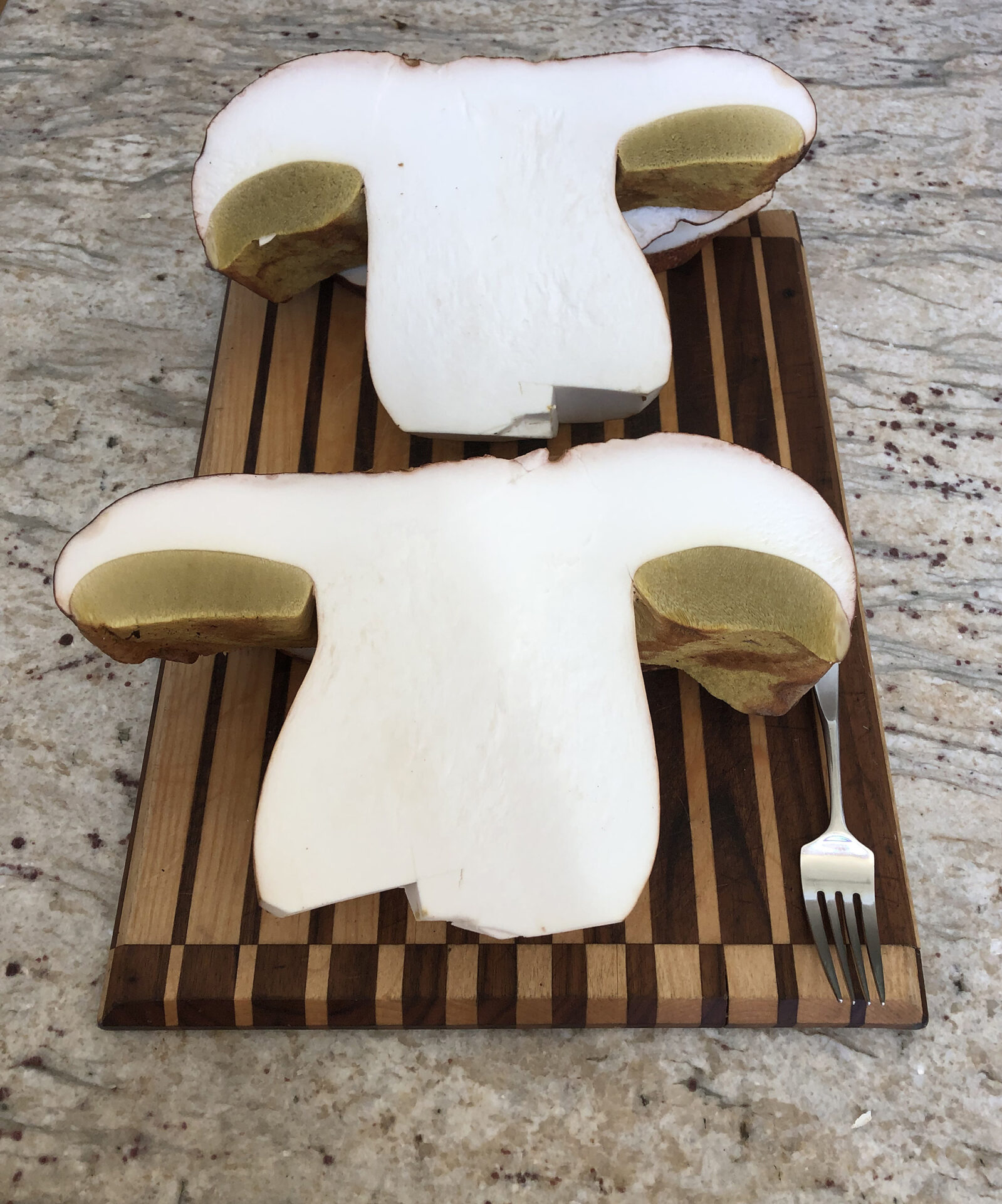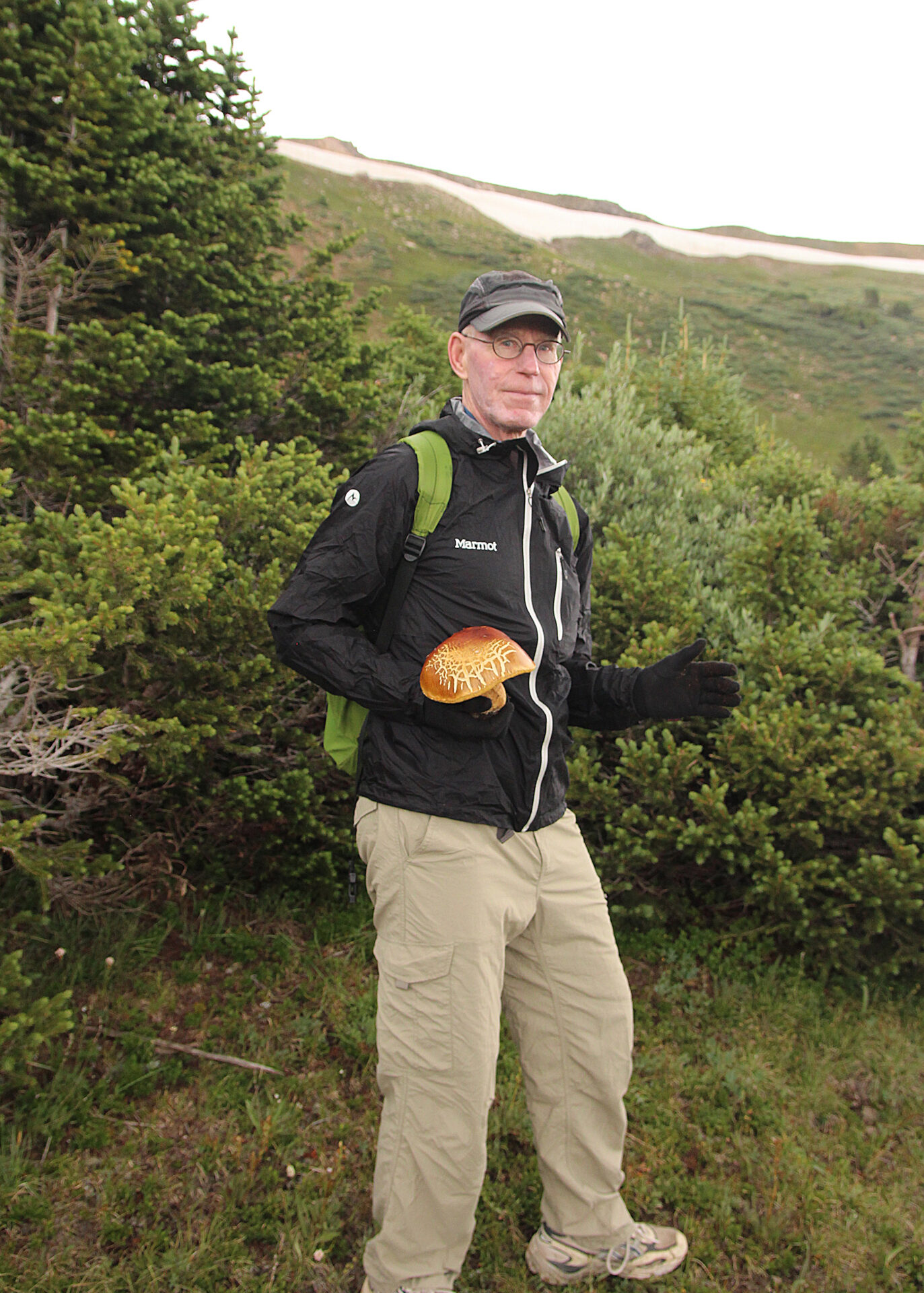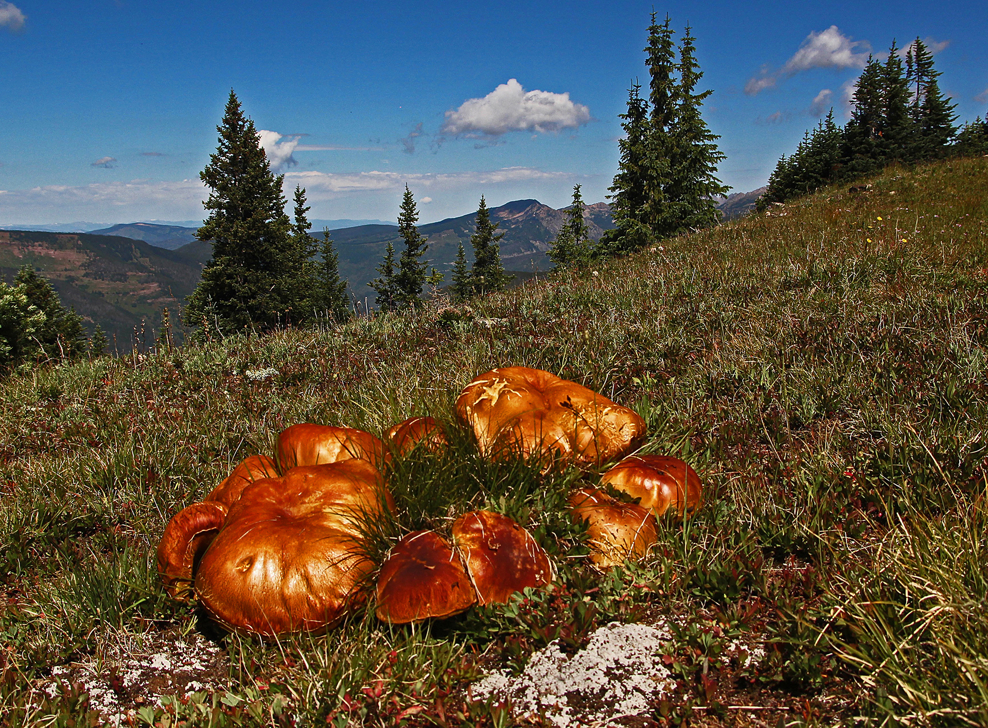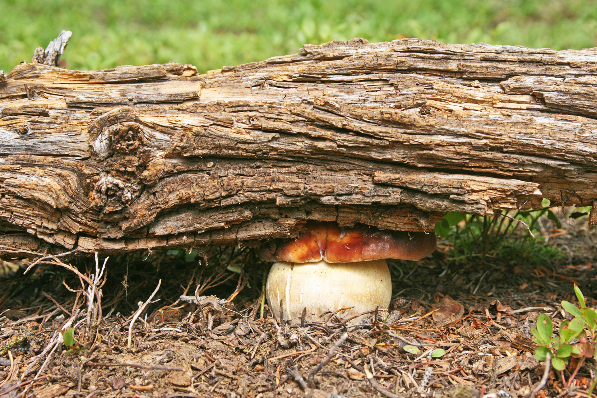 This fairy circle of porcini was so beautiful I did not disturb it.Close-up of preceding.Two perfect specimensAlmost four and a half pounds!The preceding large specimen was as perfect on the inside as on the outside.Jonathan Kriegel. We no longer need guidebooks to identify porcini.Pushing up a log.Pushing up a rock; hence “stein-liz”.My nephew Rudi Brooks, and his wife Juli.Amanita mascara indicated porcini are close. Not always this close!My brother-in-law John HutchinsonFound with my nephew Rudi.Marks of a bear.A 14-inch diameter porcino.