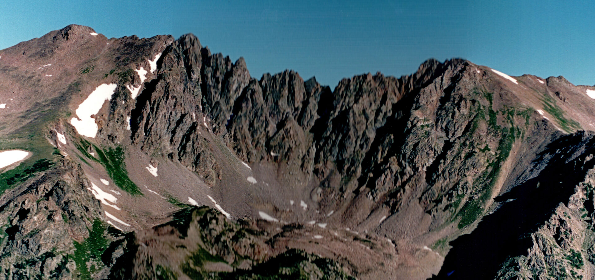 From the top there is a steep knife-edge descent to a notch, and from there the rest of the route is 3rd and 4th class scrambling on good rock. If the snow reaches high into the north side couloirs an ice ax can be helpful at the crossings.