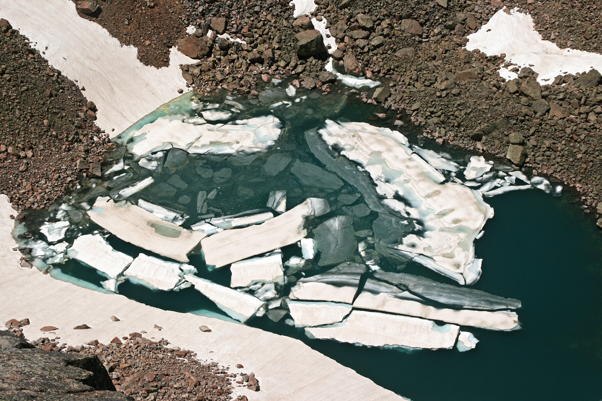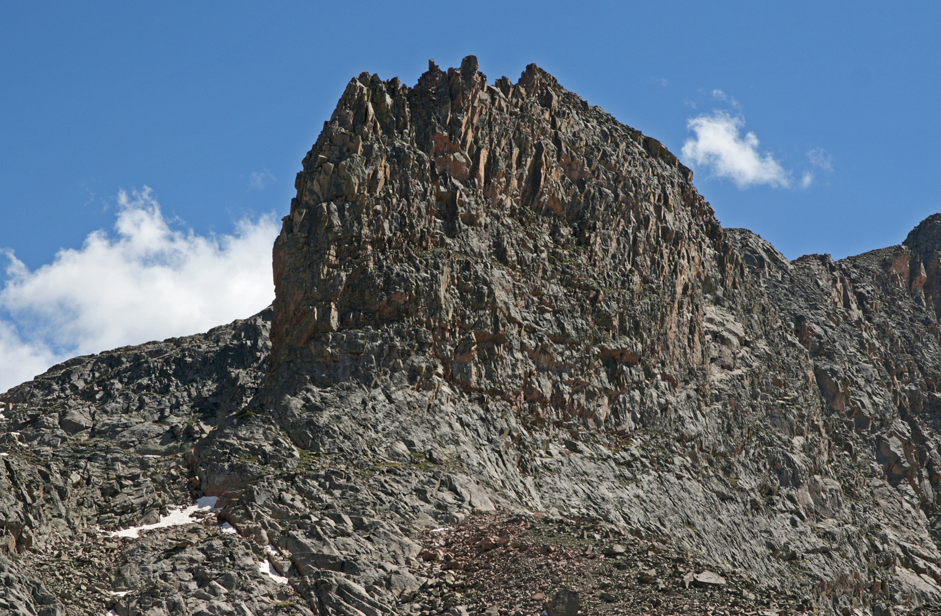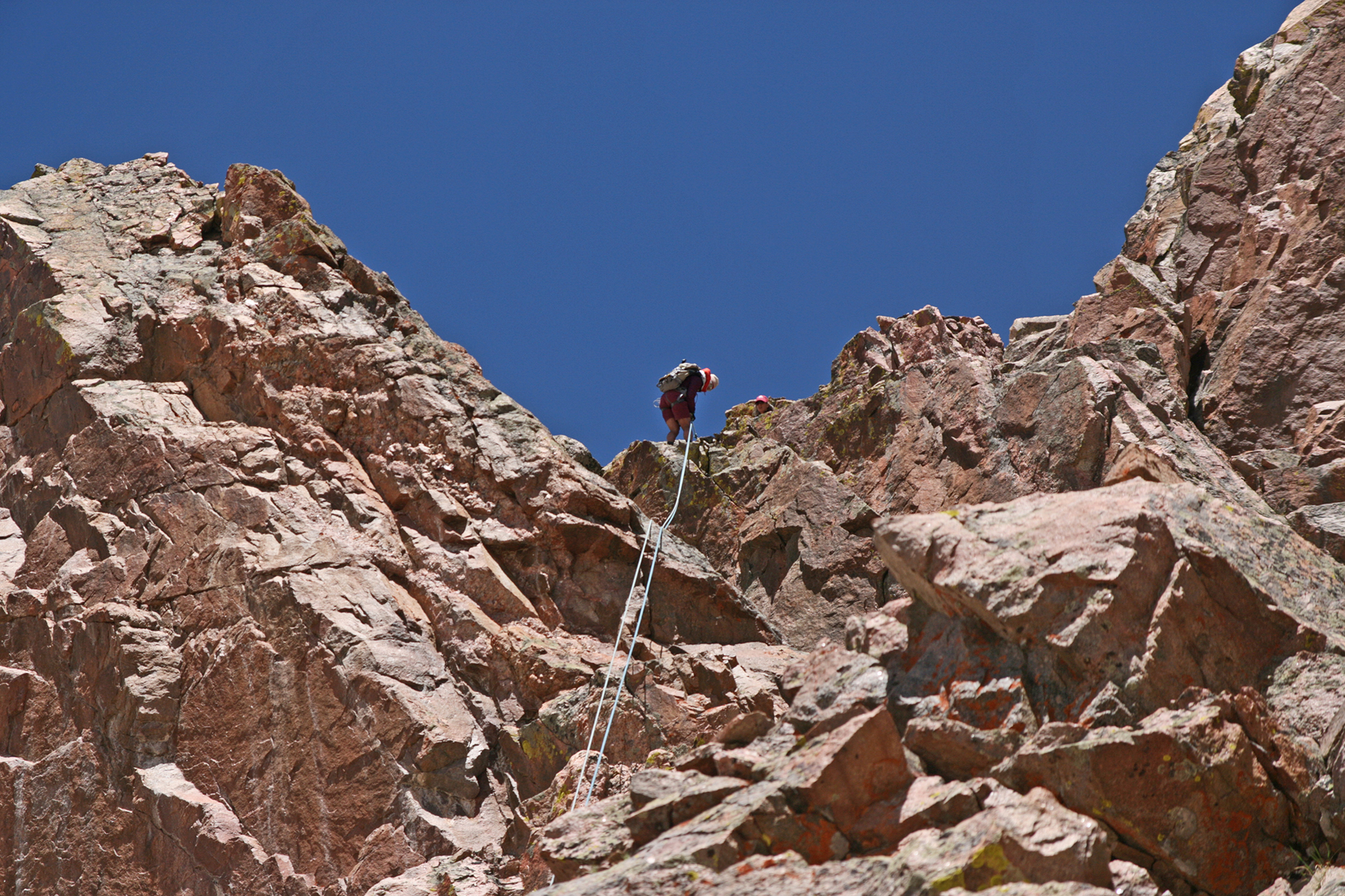 Then we rappelled down (two ropes) beside the route into the north side gully (with lots of loose rock) that took us down to the wonderful ice-filled lake, and then back out the way we came, via the high plateau at 11900 feet. Total time was 12.5 hours. A great day in perfect weather. The views from a tower such as this, in the middle of the fantastic South Rock Creek basin, are in many ways better than views from higher summits.
