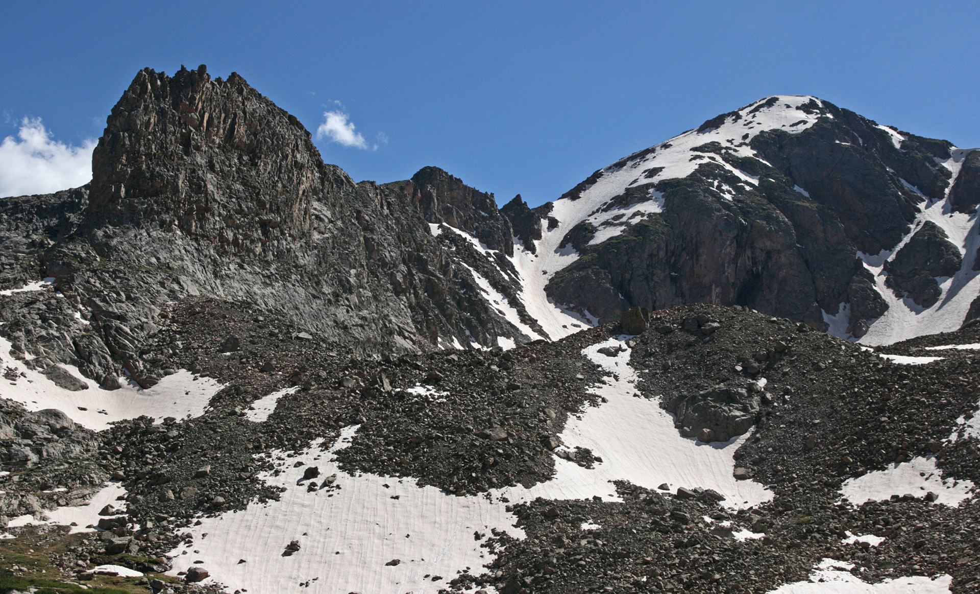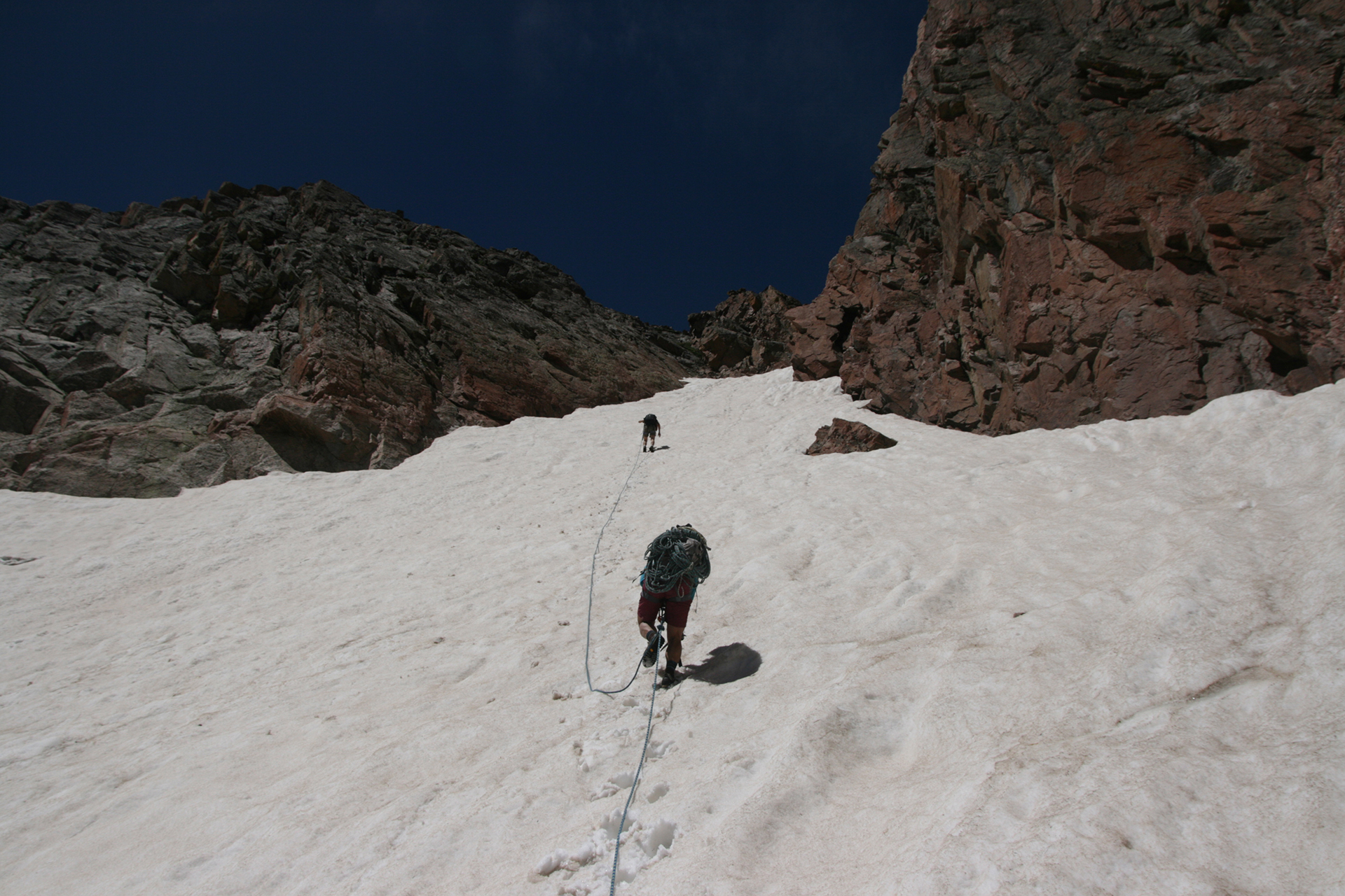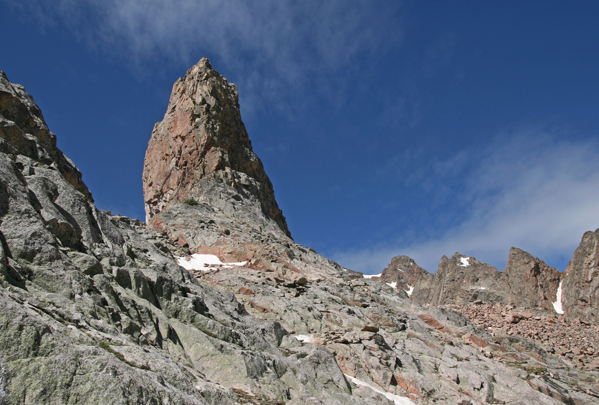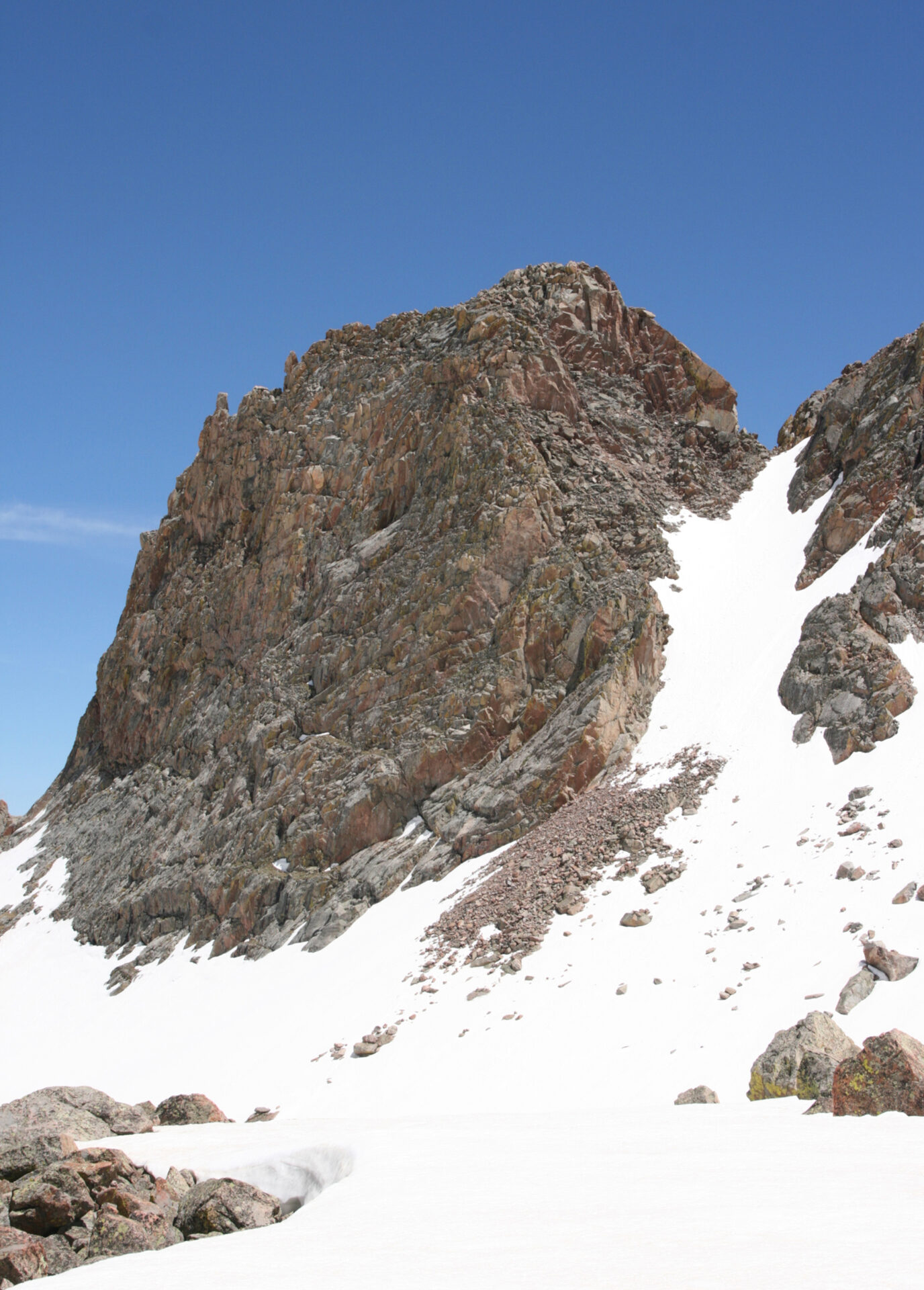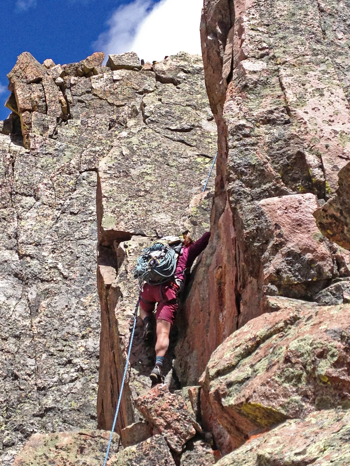 On June 25, 2013, Elke Dratch, Katie Larson, and I headed to Thor Tower, on the southern of the two very long east ridges of Valhalla. We gained the col west of Thor from its south side (some steep snow; we roped up as I did not have an ax) after passing through the Freya–Thor saddle and descending a bit. Then a bit of searching got us to a reasonable route: we traversed horizontally out onto the north face, where there was broken rock that seemed like it would work to get to the summit. Elke and I had gotten stopped at this tower after descending from Valhalla (descending Loki Spire unroped, class 4) in 2010. At that time I thought there would be a 5.2 or so route on this area of Thor’s north face.