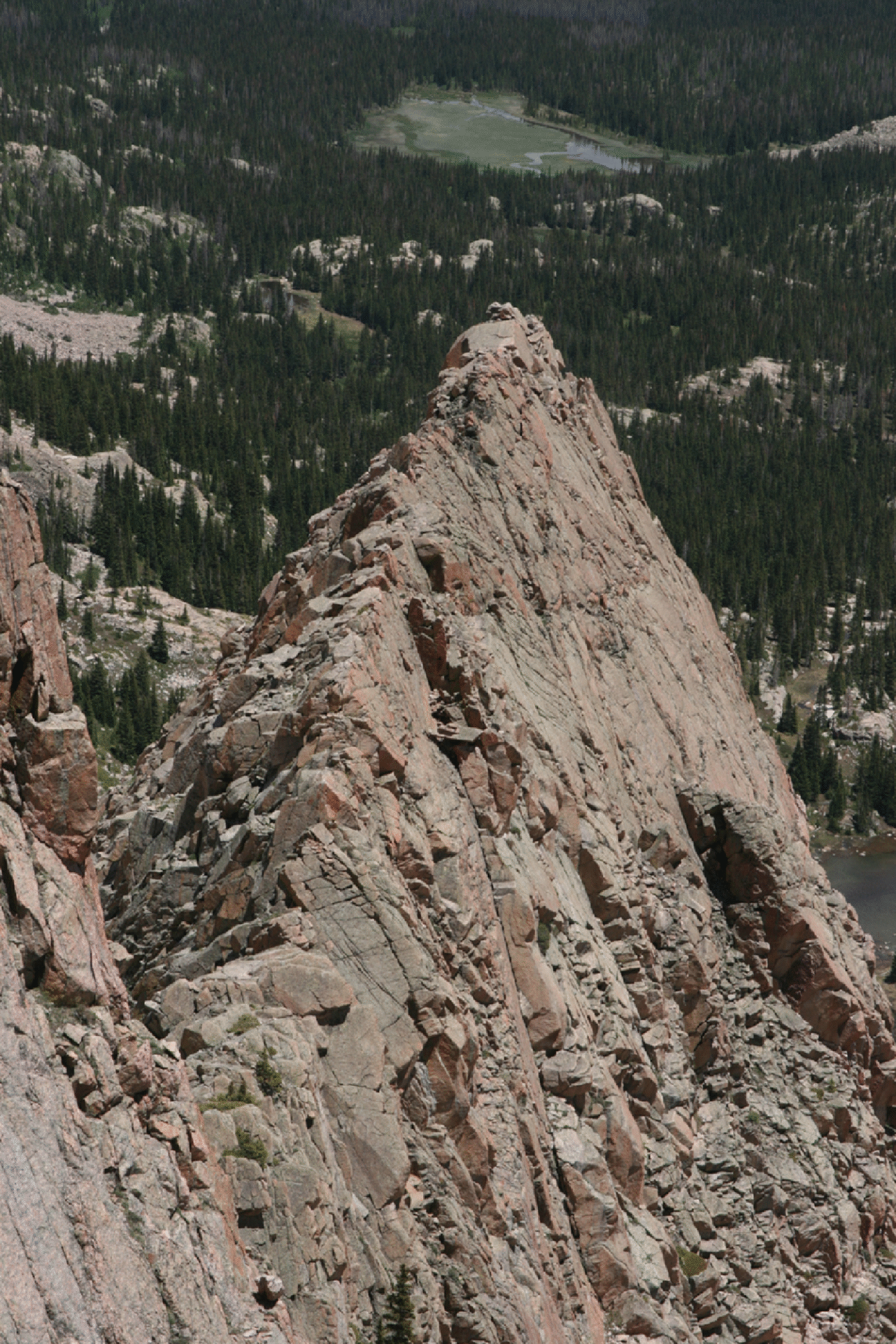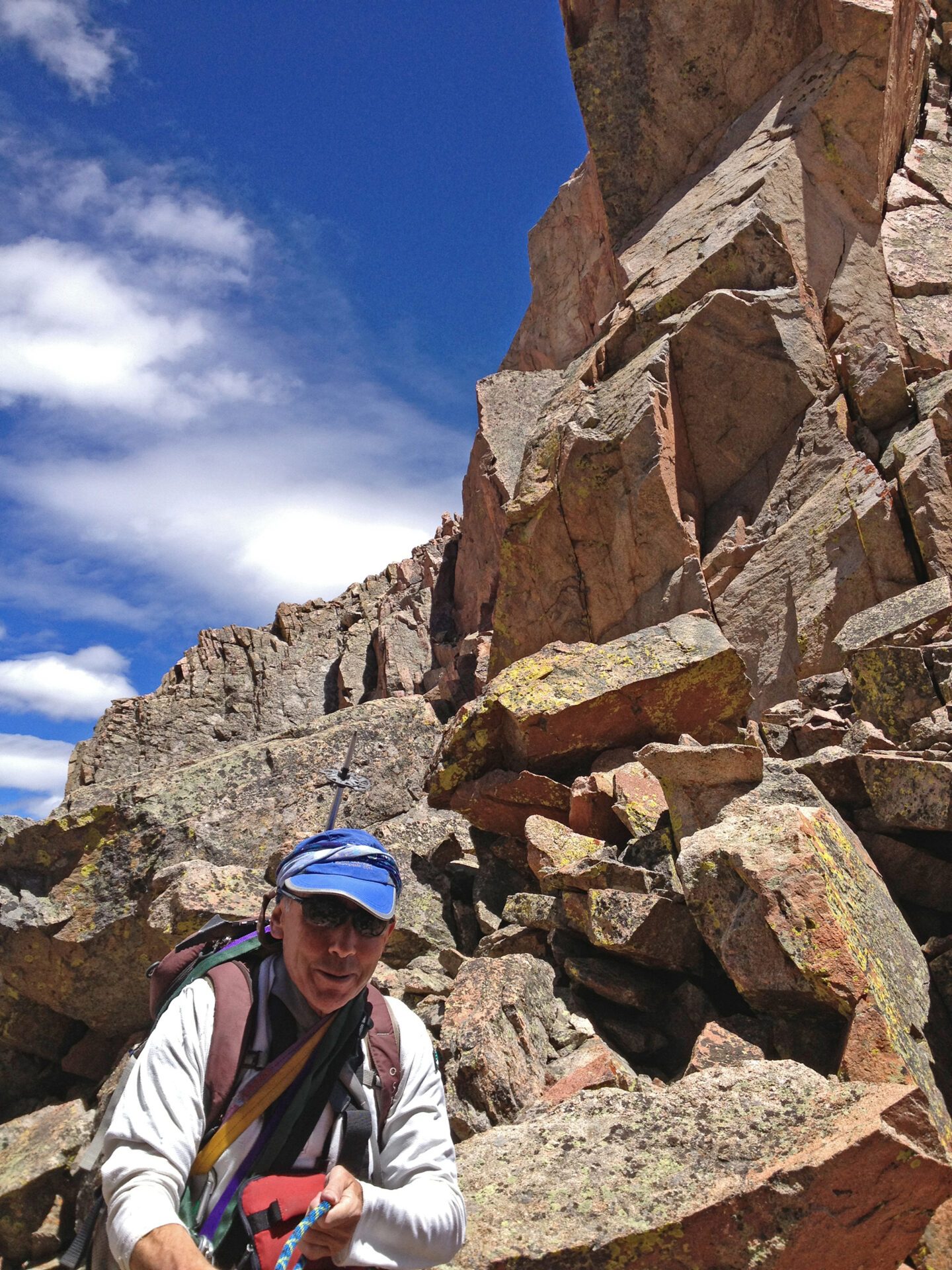 After one attempt up a slab that was too steep and holdless, I backed down and tried a little farther east and lower. That worked with one beautiful 5.6 or maybe 5.7 pitch (three pieces of protection) up to easy ground just E of the summit. Elke and Katie followed with no difficulty. There was no cairn or rappel sling in the summit area.