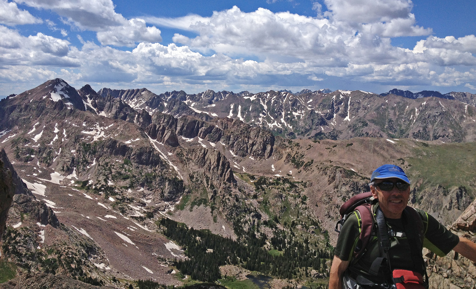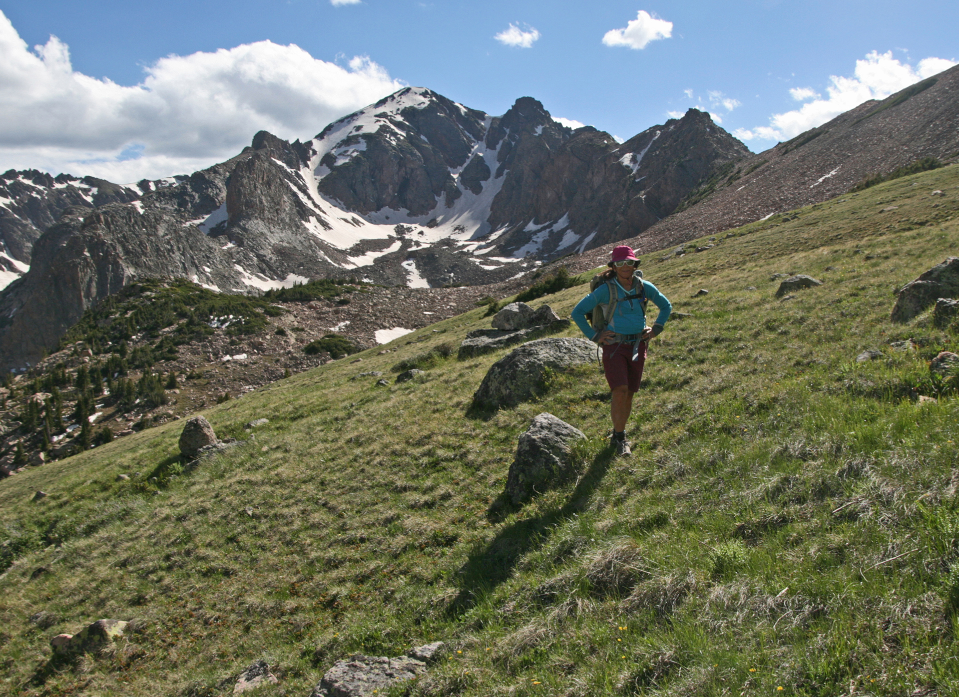 The long ridge behind Thor, leading to the north subsummit of Valhalla known as Point Odin, can be called Asgard Ridge. The flat ridge behind Odin is the Grand Traverse, with the peak at right being North Traverse Peak. Joe Kramarsic and I climbed all of Asgard Ridge from the E to the summit, and descended to Vail, in July 1997; rope used. The beautiful meadows above my head might be called Asgard Meadows.