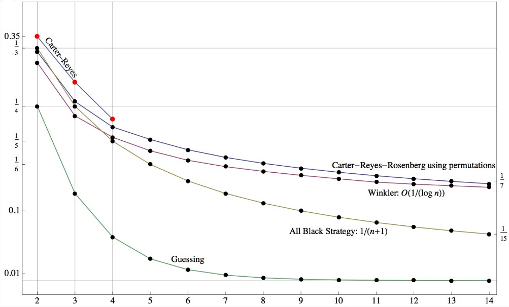 So a prominent question is whether this 7/20 is optimal for the n = 2 case. Recall that prior to their work, it was generally believed that the All-Black strategy, with success rate 1/3, was optimal.