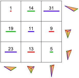 What happens here is that the three numbers in any row and column yield a triangle when the three numbers are viewed as rays emanating from a common point, with 120° between the rays. The areas of the resulting six triangles are all the same.
