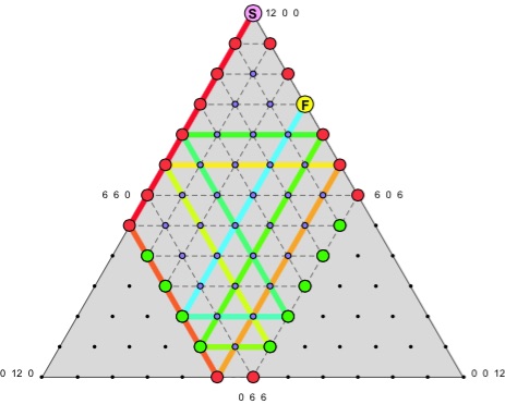 The correct way to study the problem combines graph theory and billiards. A capacity set (A, B, C) can be viewed via barycentric coordinates (also called trilinear coordinates) as a graph using discrete vertices in an equilateral triangle.