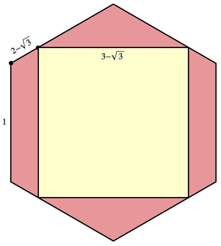 The side-length of this hexagon is √[2]/s. Now, one can show that the largest square that fits into a hexagon has side-length 3 − s times the hexagon length and starts at a point 2 − s of the way from one vertex to the next, as in