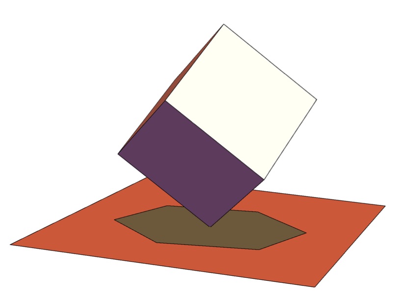 Let s = √3. To be precise, rotate the unit cube by arccos(s) around the line defined by (0, 0, 0) and (1, 1, 0). From this, one learns that the hexagon is formed from the points