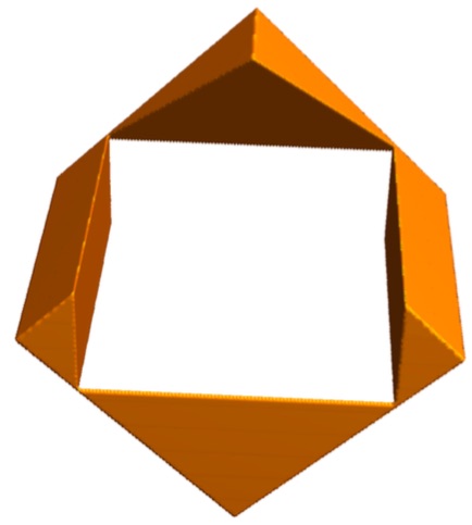 Consider the four points on the surface of a unit cube: (0, 1/4, 1), (3/4, 1, 1),(1, 3/4, 0), (1/4, 0, 0). They form a square of side length 3√[2]/4 ~ 1.0607. The square is oriented in a close-to-vertical but not true vertical position. It is the largest square that one can inscribe in a cube. For any positive epsilon, a square hole perpendicular to this square and epsilon smaller leaves the cube in one piece and allows a square to pass through. Thus the cube of side-length 3√[2]/4 is Prince Rupert's Cube: