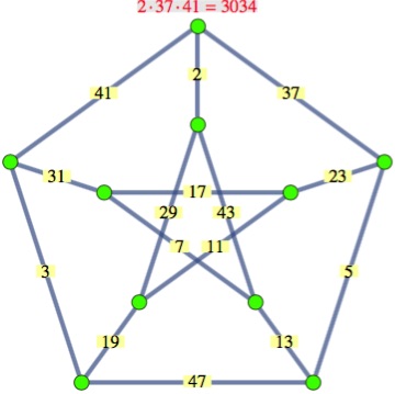 The best way to look at the given problem is to use an assignment of the first 15 prime numbers, from 2 to 47, to the 15 edges. Then if p, q, and r are assigned to the three edges from vertex V, the label p q r is given to V. Naively, there are 15! ways to make this assignment, but various tricks can be used to reduce the search. Gordon Royle, using the MINION language, proved that the assignment given above is optimal; it looks like this: