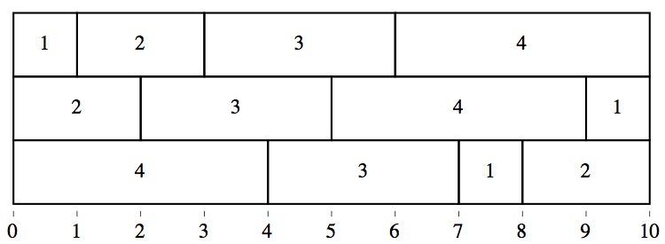 In each row, the size is a permutation of (1, 2, 3, 4). Moreover, the arrangement is such that no two of the vertical dividers between bricks is aligned. In other words, each of the 9 partial sums 1, 2, 3, 4, 5, 6, 7, 8, 9 arises once and once only when the sums along each row are formed. Three rows are used because, ignoring the ever-present terminal sum of 10, each row contributes three partial sums, for a total of 9.
