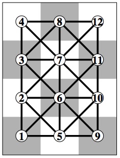 On a torus the king (just like Mr. or Ms. Pac-Man) can leave the right edge and enter on the left, or exit the top and enter on the bottom. The diagram at left below duplicates 2, 3, 4, 5, 9 and quadruplicates 1 to show all the edges. Each of the 12 vertices has 8 neighbors, so you have