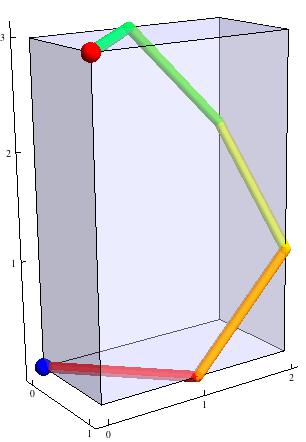 Problem of the Week 1183A Long Walk on a BoxConsider a box that spans the region from (0,0,0) to (a,b,c). Thus the x-axis edge goes from (0,0,0) to (a,0,0). Suppose an ant starts at the origin and walks on the exterior of the box so that whenever it lands on an edge it continues on the new face so as to make a 45-degree angle with that edge. To start, the ant stays horizontal, heading to (a,a,0) or (b,b,0), depending on which of a, b is larger. There are two ways to follow the 45-degree rule, and the ant chooses the direction that corresponds to following a straight line if the two sides were folded into one plane; in short, the path is (locally) a geodesic on the surface of the box: the shortest path between two points. This figure shows the case of a (1,2,3) box.