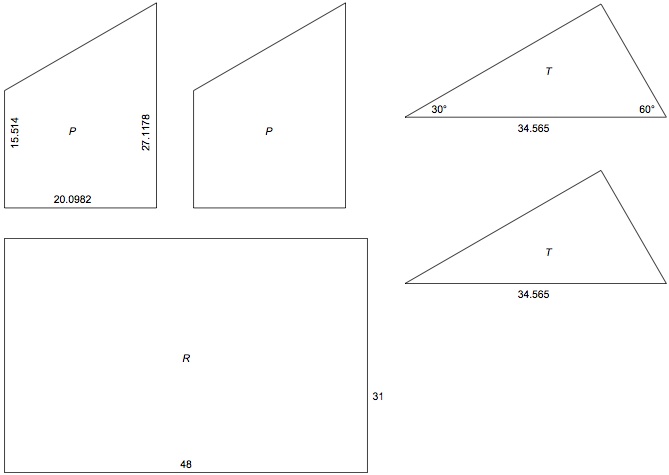 Problem of the Week 1186Coffin's Cruiser PuzzleLet R be a 48 × 31 rectangle. Let T be a 30°-60°-90° triangle with hypotenuse 34.565 (so legs are 17.2825 and 29.934). Let P be a right trapezoid with base 20.0982 and altitudes 27.1178 and 15.514:
