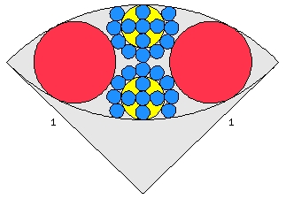 Problem of the Week 999Japanese CirclesWhat is the radius of each of the two large circles? The radius of the sector is 1 and all apparent tangencies, symmetries, and congruences are true. So there are exactly three sizes of full circles shown.