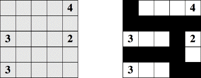 Problem of the Week 1077NurikabeThe March 21 New York Times had a nice article by Will Shortz on several new types of puzzles originating in Japan: Inside Japan's Puzzle Palace (requires registration with nytimes.com). I found nurikabe (also known as Islands in the Stream), invented by Nikoli, to be particularly pleasing. This diagram gives a simple nurikabe, along with its solution: