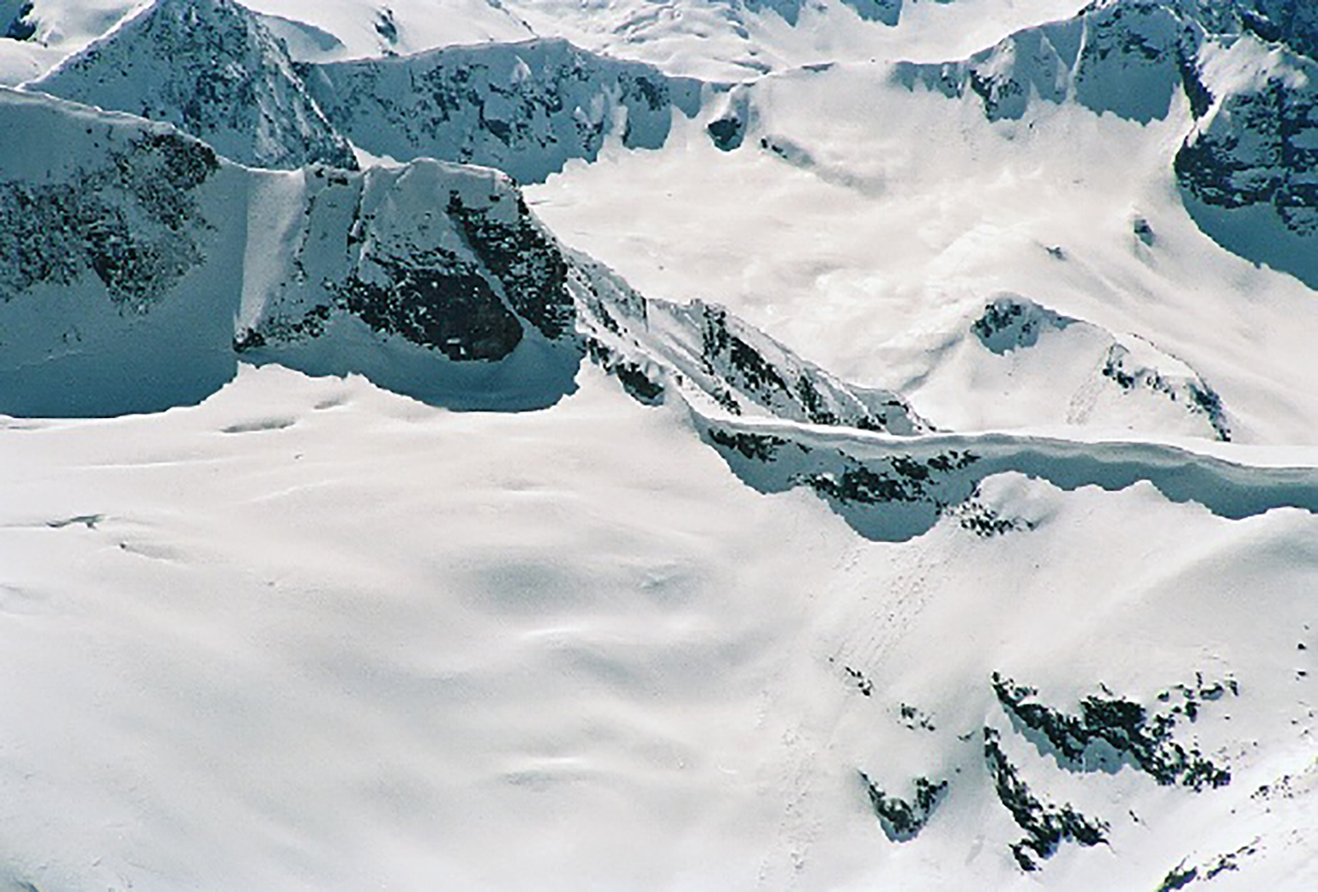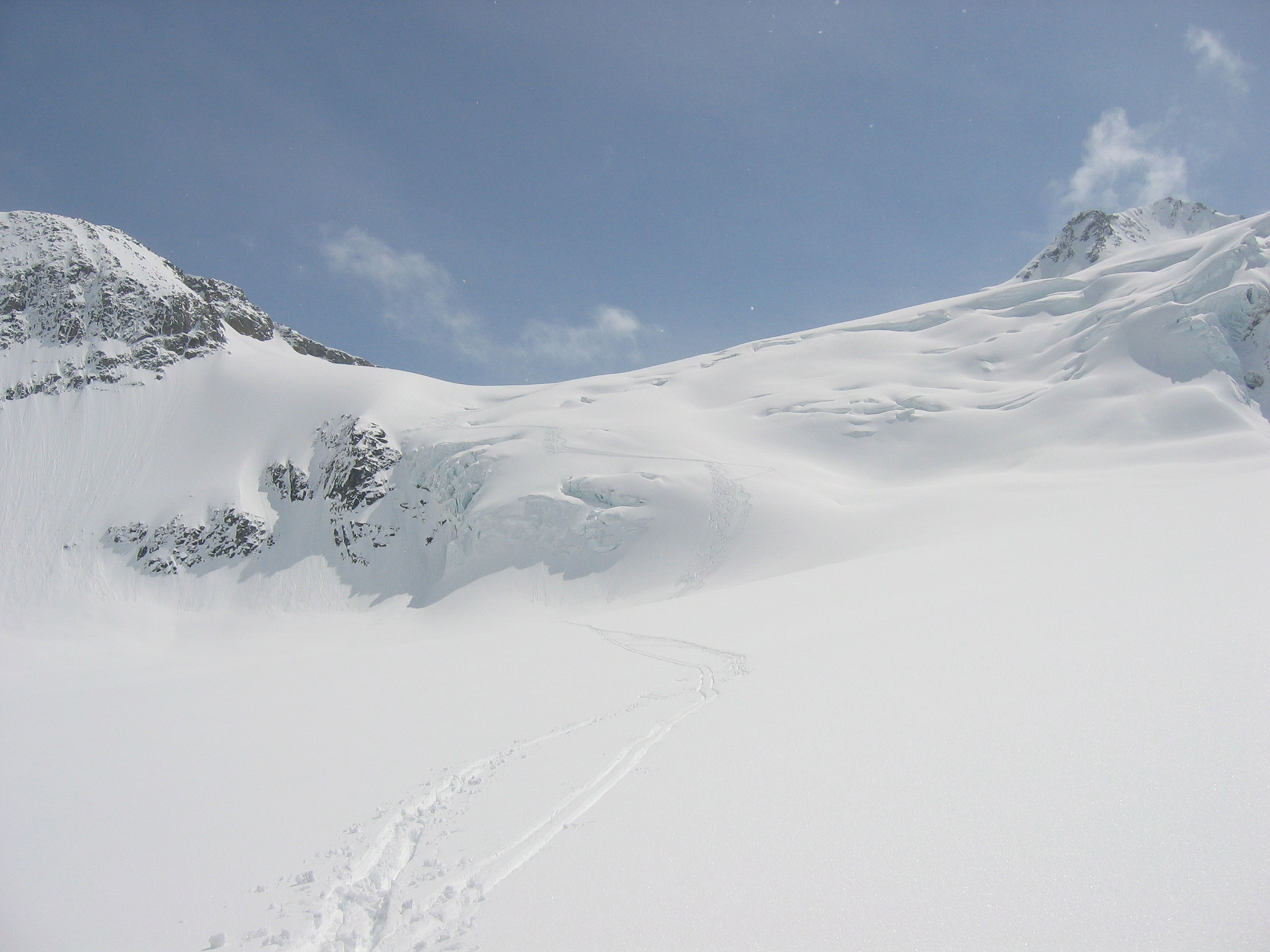 The next day had more good weather and we decided on the high route to the Houston Glacier via Oasis Pass, as opposed to a route down from the lake to low-lying Houston Creek. The latter would have been a short route, but staying out of the trees is always more attractive. The climb to Oasis Pass was easy, and from the pass we had super views of entire ranges to the north and west that we had not seen before. The next part of the planned route had no glaciers, but that does not mean that it would be easy. On the contrary, these high slopes above Kellie Creek, while an easy route in summer, are on steep south- and southwest-facing slopes that could provide serious avalanche hazard on a sunny day, as this one was. The first part was a slightly descending traverse over terrain with a lot of avalanche debris; because of temperature and aspect this slope seemed safe at this time.