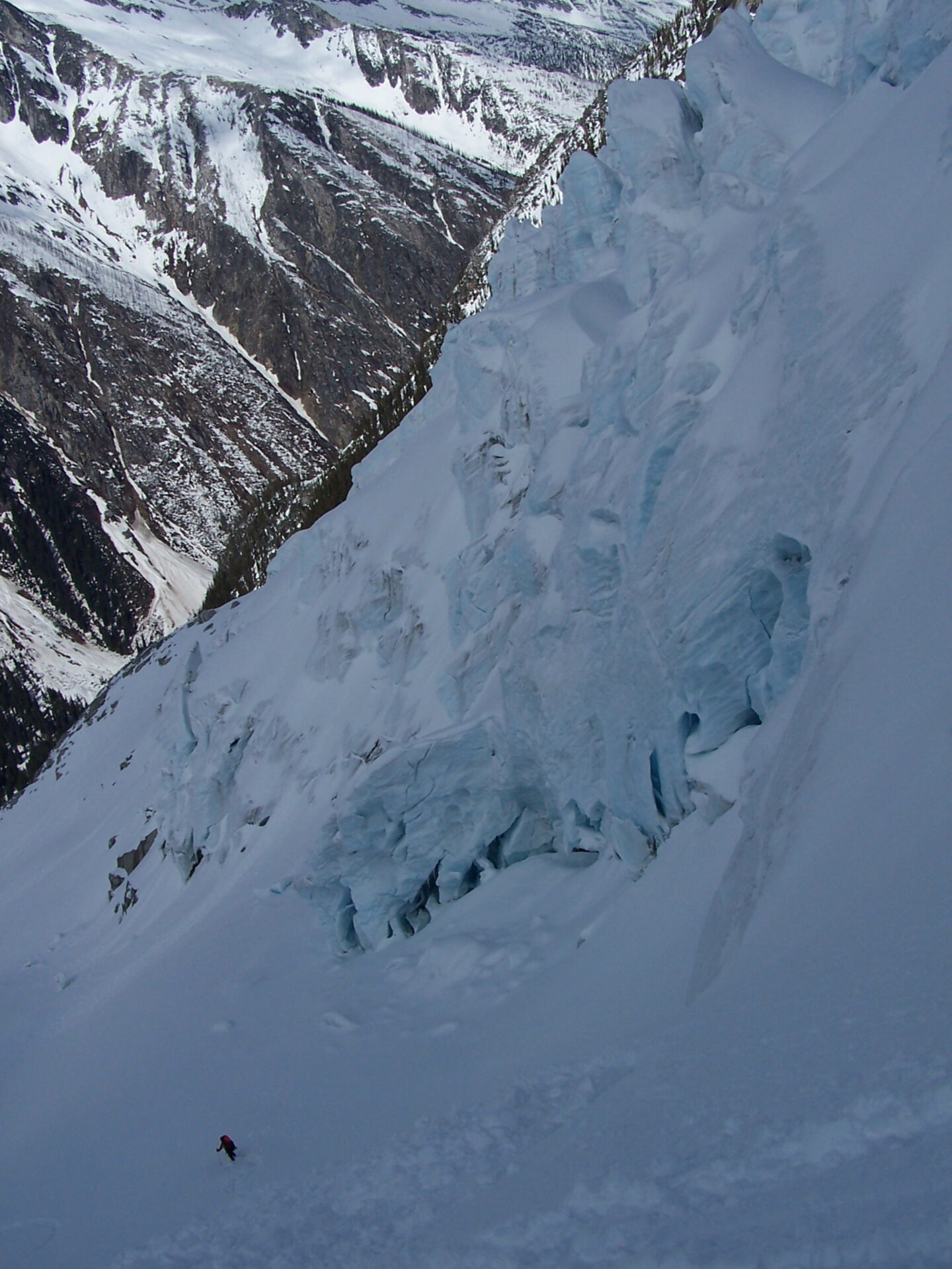 At the lodge we learned of two other teams: one had gone from the Nemo Glacier to Revelstoke and the other from the town of Ferguson to Rogers Pass. These groups had excellent weather and made some noteworthy ascents en route, such as Moby Dick. And their routes, which passed through the Abbey were much longer than ours. Yet our line into BA was perhaps more natural, as it followed the spine of the Westfall Group from bottom to top. What is remarkable is that the three groups got through the steep terrain near the Wrong group in entirely different ways: The Stan Metcalfe group went from Oasis Pass to a col between the two peaks of Claggart and down the north ridge and northwest face of Billy Budd, while the other group got to Oasis Lake after finding a way through the Chinese Wall. From the lake they went down to Houston Creek. We were the only group to pass through the snout of the Wrong or to travel by the west side of Billy Budd.